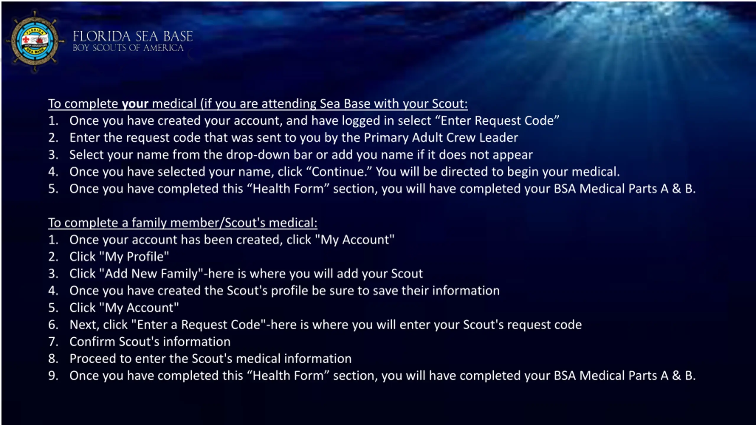 To complete your medical (if you are attending Sea Base with your Scout: 1. Once you have created your account, and have logged in select Enter Request Code 2. Enter the request code that was sent to you by the Primary Adult Crew Leader 3. Select your name from the drop-down bar or add you name if it does not appear 4. Once you have selected your name, click Continue. You will be directed to begin your medical. 5. Once you have completed this Health Form section, you will have completed your BSA Medical Parts A & B. To complete a family member/Scout's medical: 1. Once your account has been created, click "My Account" 2. Click "My Profile" 3. Click "Add New Family"-here is where you will add your Scout 4. Once you have created the Scout's profile be sure to save their information 5. Click "My Account" 6. Next, click "Enter a Request Code"-here is where you will enter your Scout's request code 7. Confirm Scout's information 8. Proceed to enter the Scout's medical information 9. Once you have completed this Health Form section, you will have completed your BSA Medical Parts A & B.