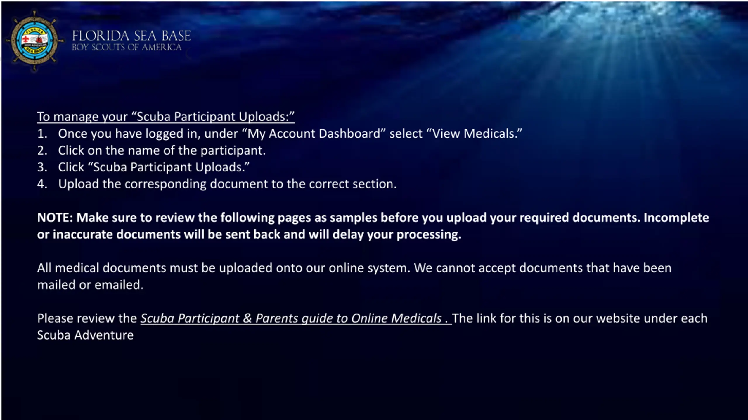 To manage your Scuba Participant Uploads: 1. Once you have logged in, under My Account Dashboard select View Medicals. 2. Click on the name of the participant. 3. Click Scuba Participant Uploads. 4. Upload the corresponding document to the correct section. NOTE: Make sure to review the following pages as samples before you upload your required documents. Incomplete or inaccurate documents will be sent back and will delay your processing. All medical documents must be uploaded onto our online system. We cannot accept documents that have been mailed or emailed. Please review the Scuba Participant & Parents guide to Online Medicals . The link for this is on our website under each Scuba Adventure