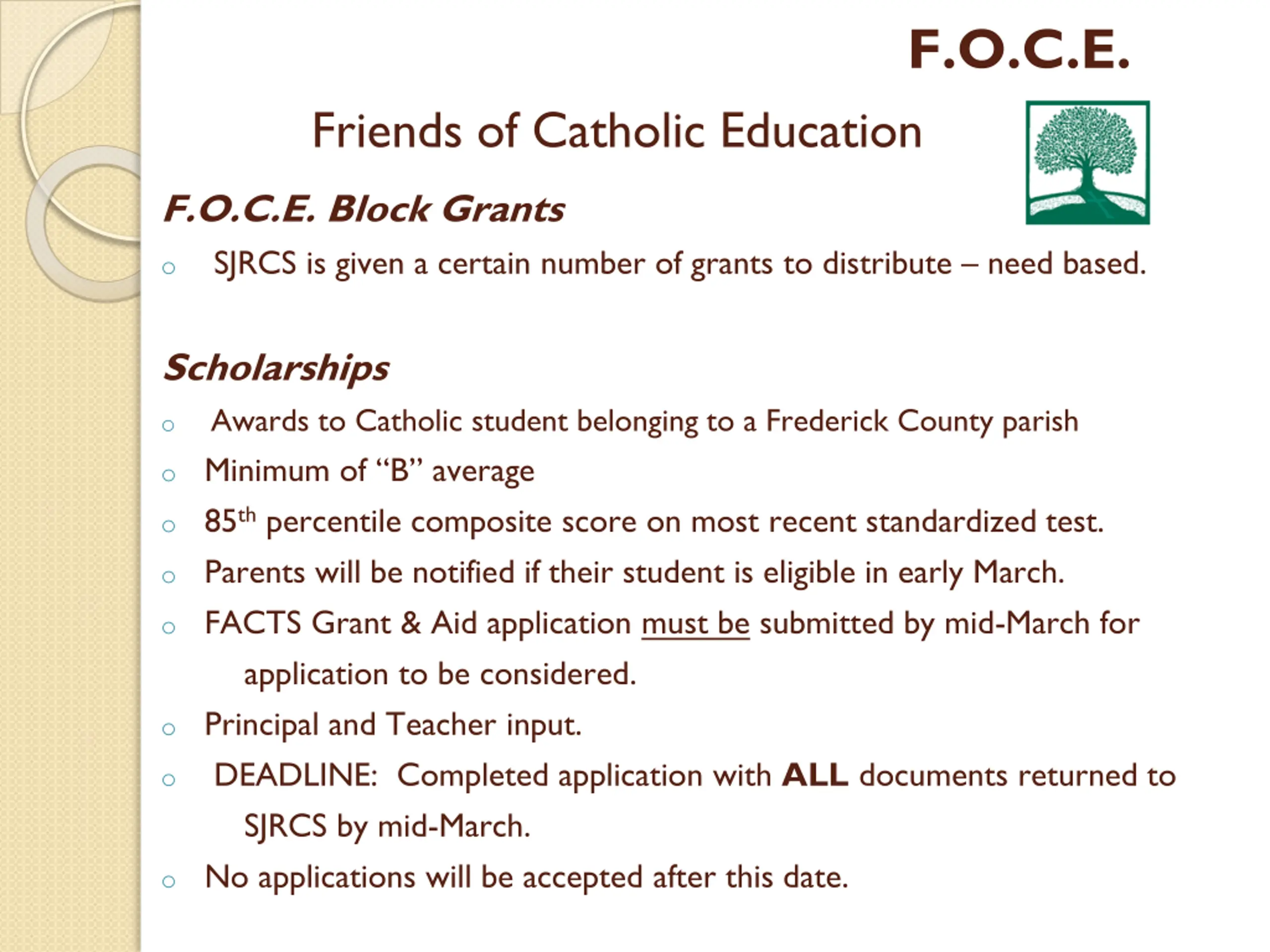 F.O.C.E. Friends of Catholic Education F.O.C.E. Block Grants SJRCS is given a certain number of grants to distribute need based. o Scholarships Awards to Catholic student belonging to a Frederick County parish o Minimum of B average o 85thpercentile composite score on most recent standardized test. o Parents will be notified if their student is eligible in early March. o FACTS Grant & Aid application must be submitted by mid-March for application to be considered. o Principal and Teacher input. DEADLINE: Completed application with ALL documents returned to SJRCS by mid-March. o No applications will be accepted after this date. o o