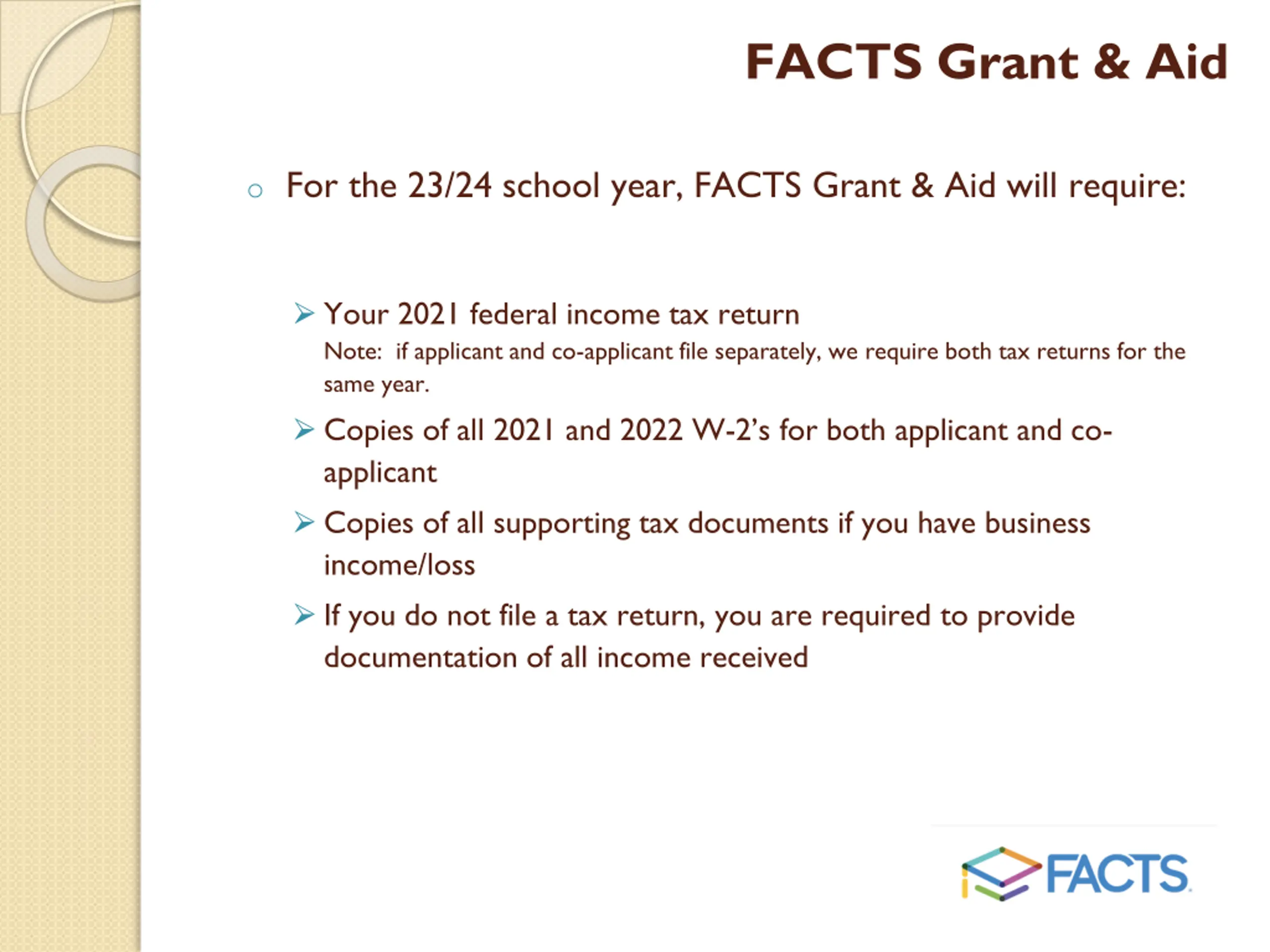 FACTS Grant & Aid o For the 23/24 school year, FACTS Grant & Aid will require: Your 2021 federal income tax return Note: if applicant and co-applicant file separately, we require both tax returns for the same year. Copies of all 2021 and 2022 W-2 s for both applicant and co- applicant Copies of all supporting tax documents if you have business income/loss If you do not file a tax return, you are required to provide documentation of all income received