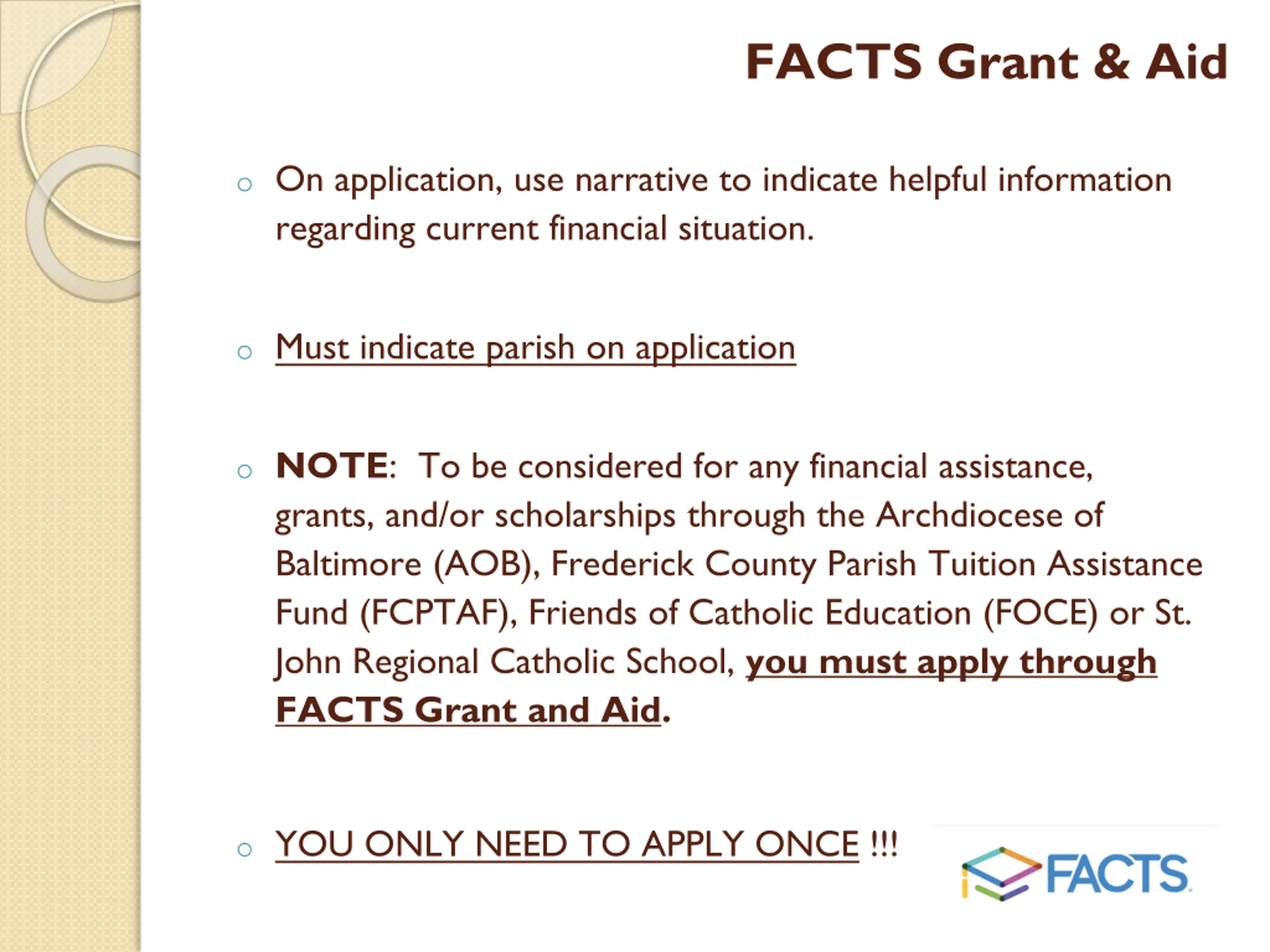 FACTS Grant & Aid o On application, use narrative to indicate helpful information regarding current financial situation. o Must indicate parish on application o NOTE: To be considered for any financial assistance, grants, and/or scholarships through the Archdiocese of Baltimore (AOB), Frederick County Parish Tuition Assistance Fund (FCPTAF), Friends of Catholic Education (FOCE) or St. John Regional Catholic School, you must apply through FACTS Grant and Aid. o YOU ONLY NEED TO APPLY ONCE !!!