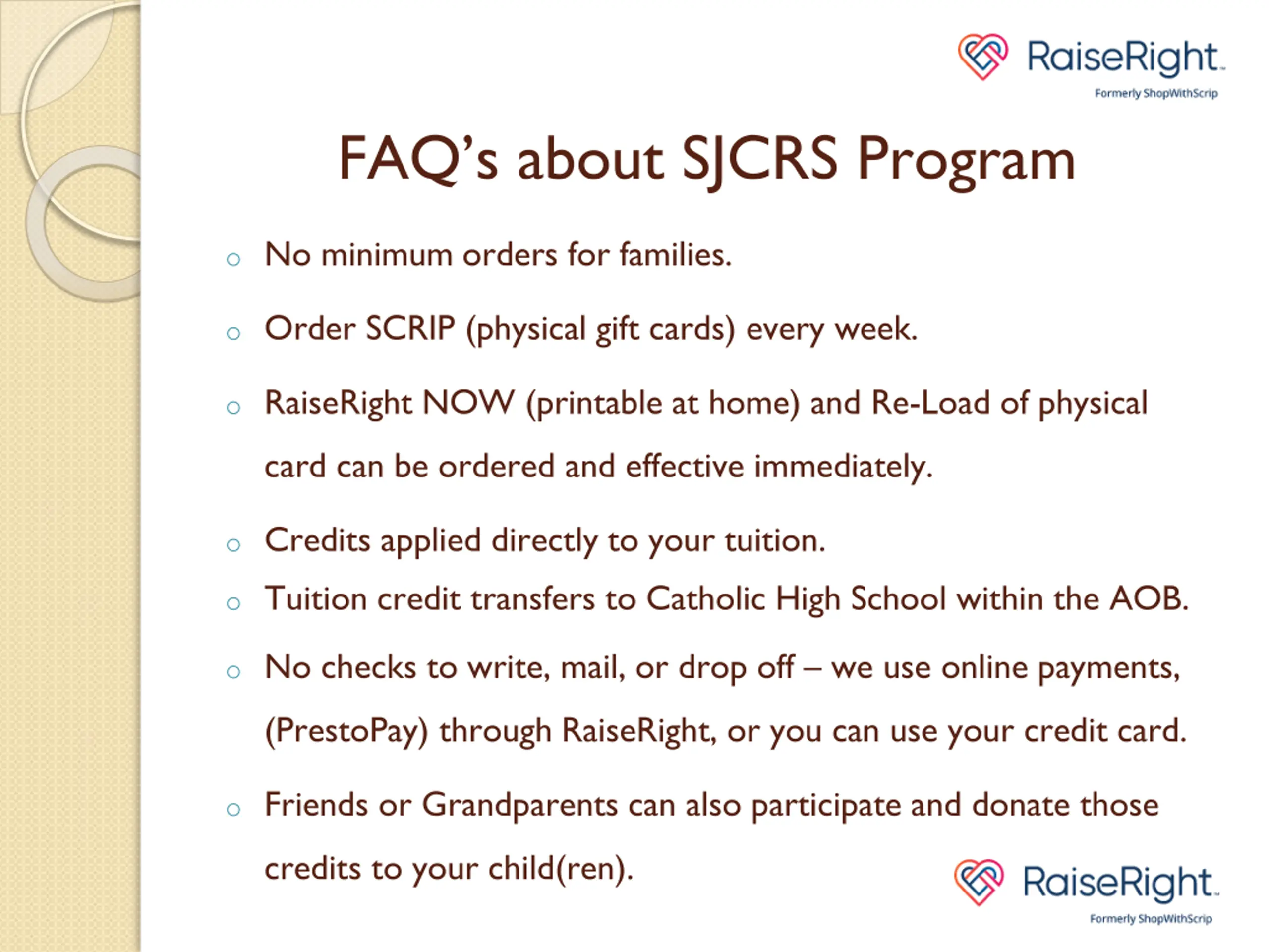 FAQs about SJCRS Program o No minimum orders for families. o Order SCRIP (physical gift cards) every week. o RaiseRight NOW (printable at home) and Re-Load of physical card can be ordered and effective immediately. o Credits applied directly to your tuition. o Tuition credit transfers to Catholic High School within the AOB. o No checks to write, mail, or drop off we use online payments, (PrestoPay) through RaiseRight, or you can use your credit card. o Friends or Grandparents can also participate and donate those credits to your child(ren).