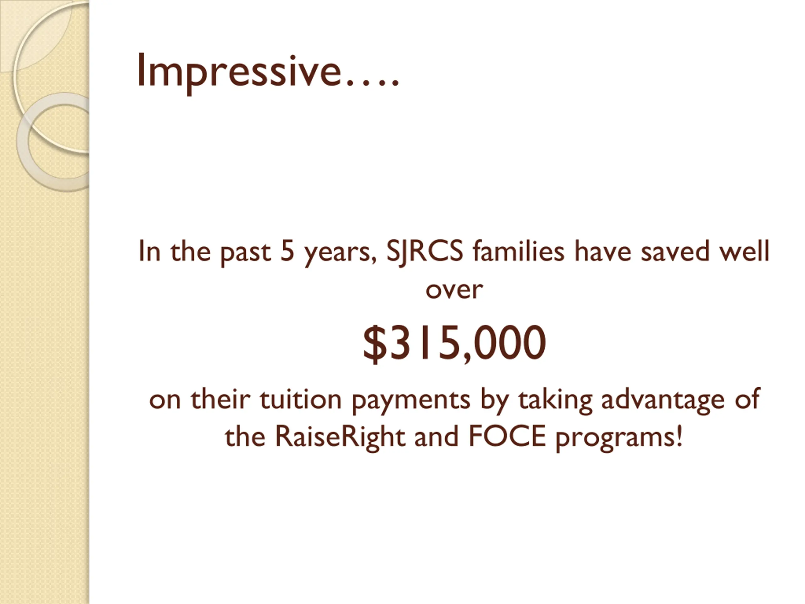 Impressive. In the past 5 years, SJRCS families have saved well over $315,000 on their tuition payments by taking advantage of the RaiseRight and FOCE programs!