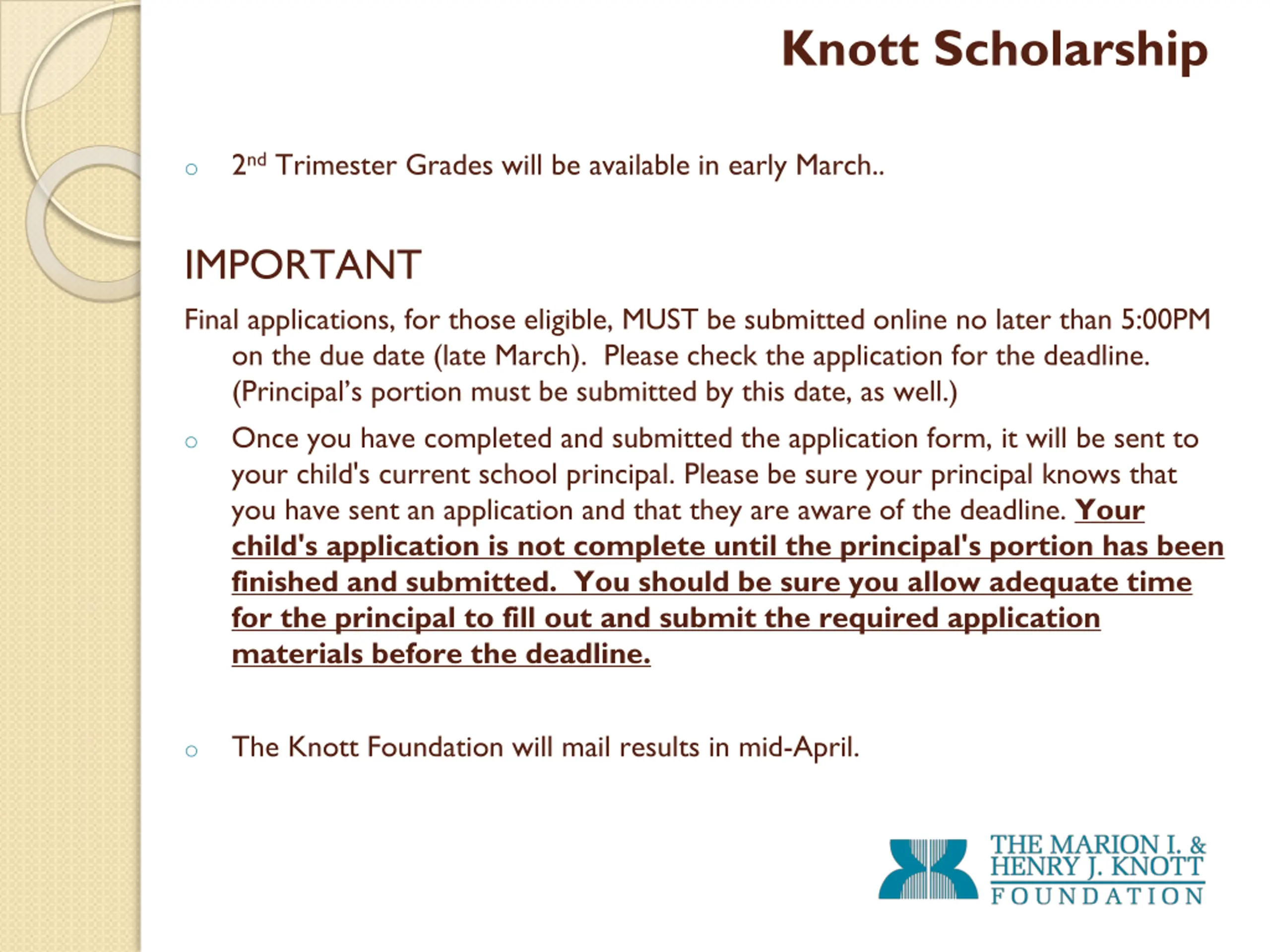 Knott Scholarship 2ndTrimester Grades will be available in early March.. o IMPORTANT Final applications, for those eligible, MUST be submitted online no later than 5:00PM on the due date (late March). Please check the application for the deadline. (Principal s portion must be submitted by this date, as well.) Once you have completed and submitted the application form, it will be sent to your child's current school principal. Please be sure your principal knows that you have sent an application and that they are aware of the deadline. Your child's application is not complete until the principal's portion has been finished and submitted. You should be sure you allow adequate time for the principal to fill out and submit the required application materials before the deadline. o The Knott Foundation will mail results in mid-April. o
