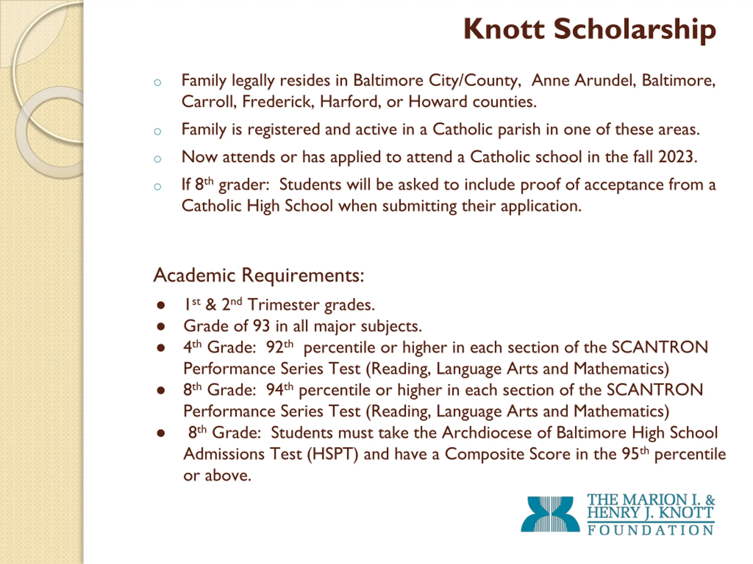 Knott Scholarship Family legally resides in Baltimore City/County, Anne Arundel, Baltimore, Carroll, Frederick, Harford, or Howard counties. Family is registered and active in a Catholic parish in one of these areas. Now attends or has applied to attend a Catholic school in the fall 2023. If 8thgrader: Students will be asked to include proof of acceptance from a Catholic High School when submitting their application. o o o o Academic Requirements: 1st& 2ndTrimester grades. Grade of 93 in all major subjects. 4thGrade: 92thpercentile or higher in each section of the SCANTRON Performance Series Test (Reading, Language Arts and Mathematics) 8thGrade: 94thpercentile or higher in each section of the SCANTRON Performance Series Test (Reading, Language Arts and Mathematics) 8thGrade: Students must take the Archdiocese of Baltimore High School Admissions Test (HSPT) and have a Composite Score in the 95thpercentile or above.