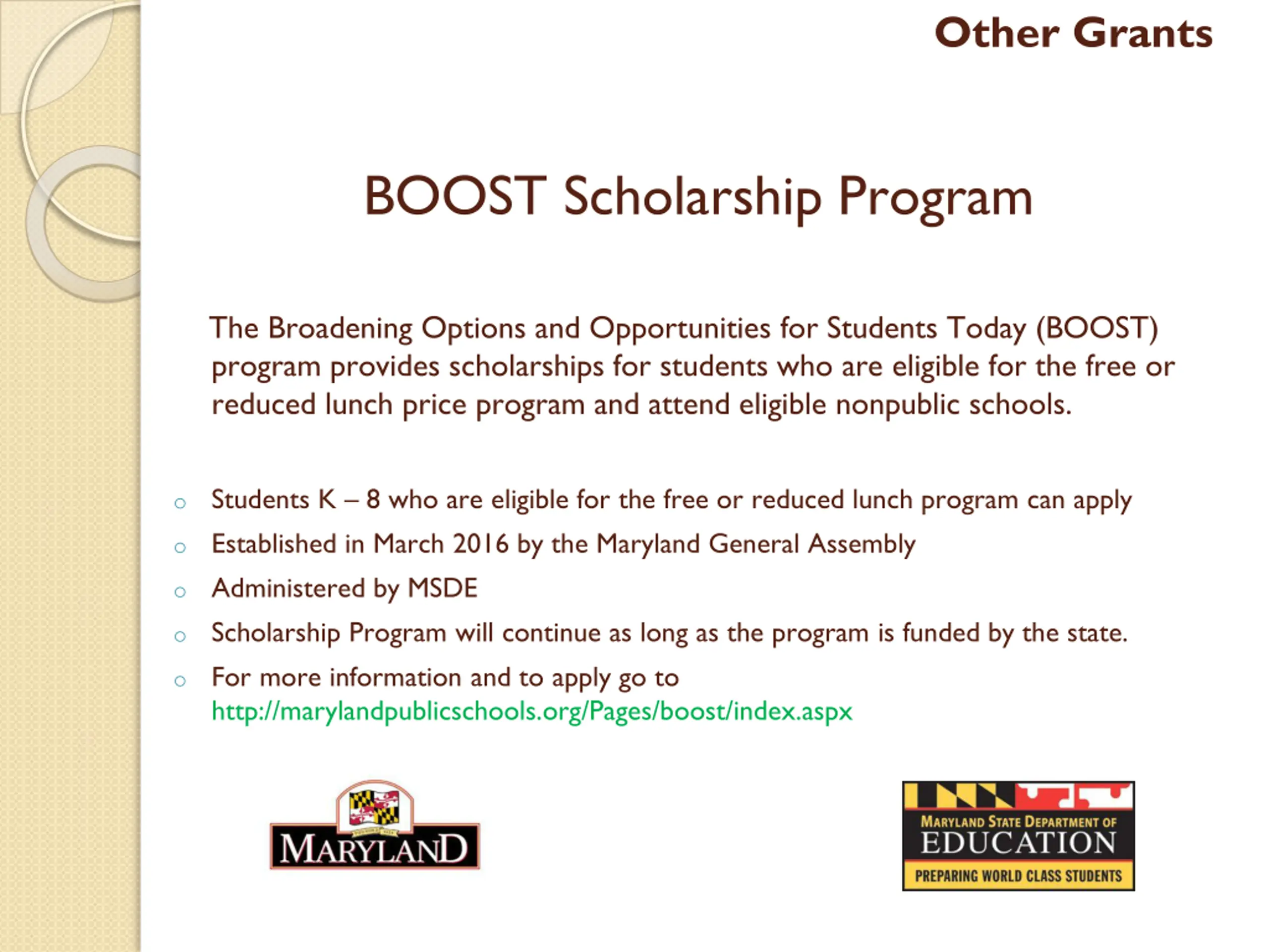 Other Grants BOOST Scholarship Program The Broadening Options and Opportunities for Students Today (BOOST) program provides scholarships for students who are eligible for the free or reduced lunch price program and attend eligible nonpublic schools. o Students K 8 who are eligible for the free or reduced lunch program can apply o Established in March 2016 by the Maryland General Assembly o Administered by MSDE o Scholarship Program will continue as long as the program is funded by the state. o For more information and to apply go to http://marylandpublicschools.org/Pages/boost/index.aspx
