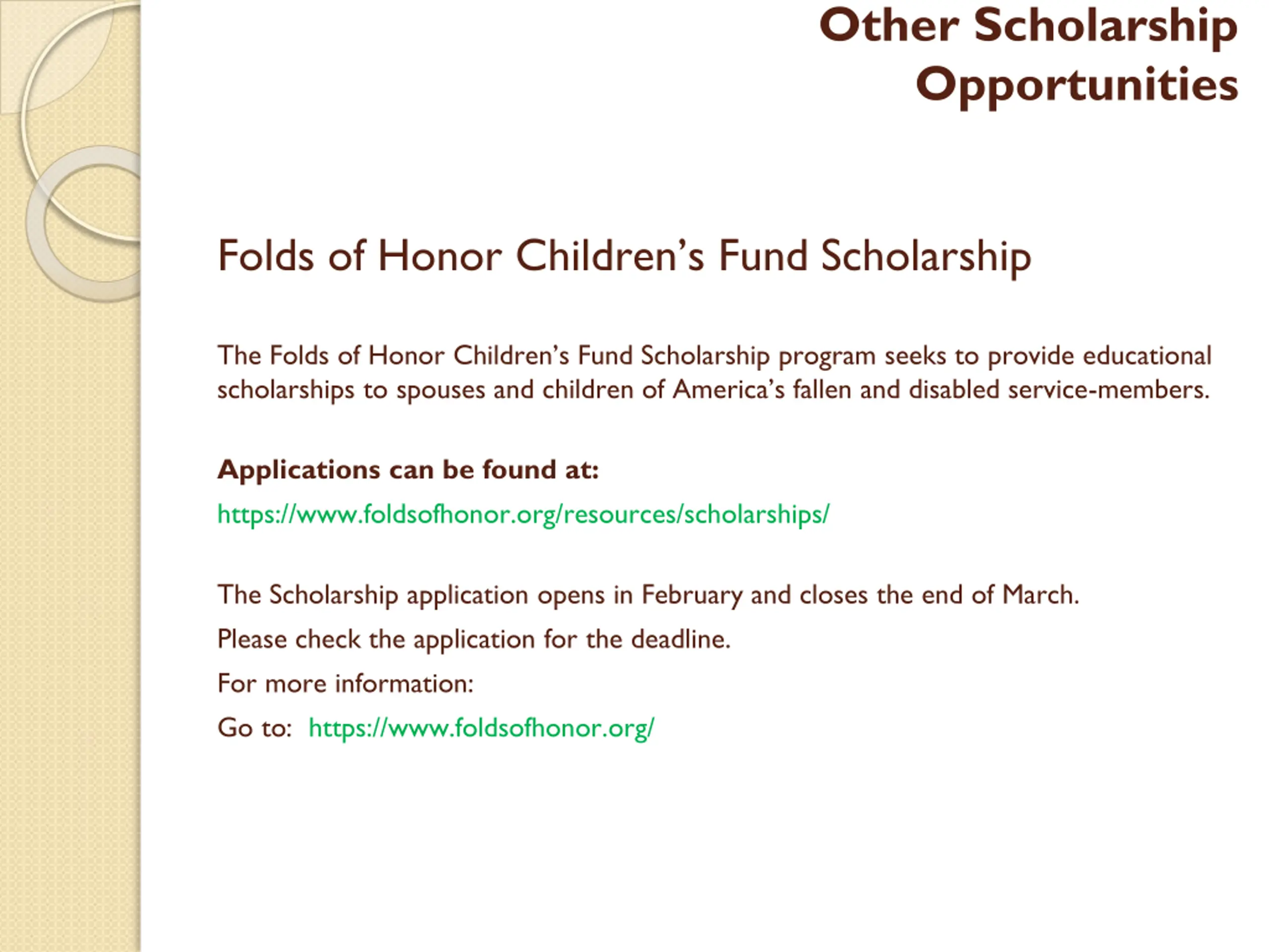 Other Scholarship Opportunities Folds of Honor Children s Fund Scholarship The Folds of Honor Children s Fund Scholarship program seeks to provide educational scholarships to spouses and children of America s fallen and disabled service-members. Applications can be found at: https://www.foldsofhonor.org/resources/scholarships/ The Scholarship application opens in February and closes the end of March. Please check the application for the deadline. For more information: Go to: https://www.foldsofhonor.org/