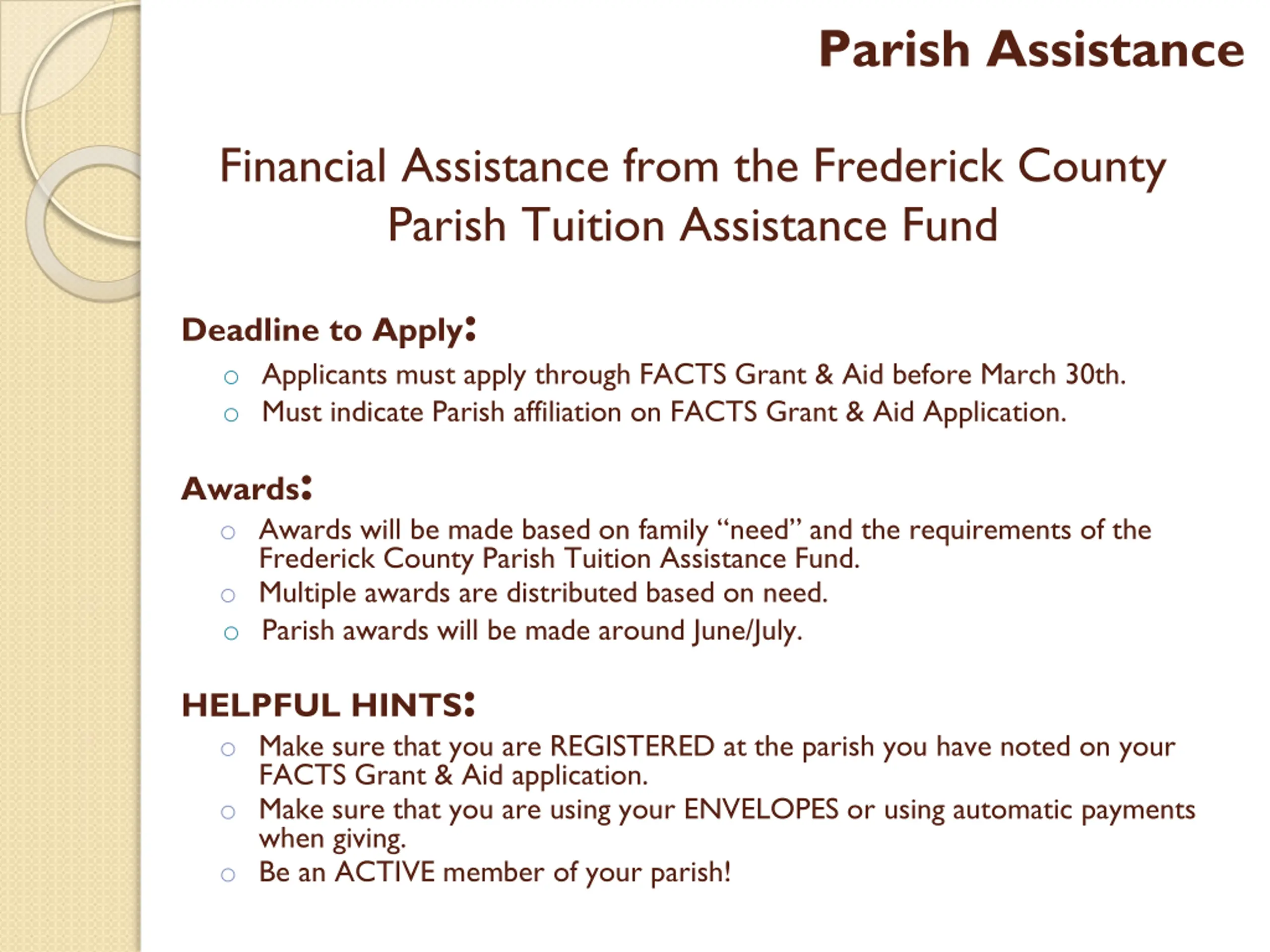Parish Assistance Financial Assistance from the Frederick County Parish Tuition Assistance Fund Deadline to Apply: o Applicants must apply through FACTS Grant & Aid before March 30th. o Must indicate Parish affiliation on FACTS Grant & Aid Application. Awards: o Awards will be made based on family need and the requirements of the Frederick County Parish Tuition Assistance Fund. o Multiple awards are distributed based on need. o Parish awards will be made around June/July. HELPFUL HINTS: o Make sure that you are REGISTERED at the parish you have noted on your FACTS Grant & Aid application. o Make sure that you are using your ENVELOPES or using automatic payments when giving. o Be an ACTIVE member of your parish!
