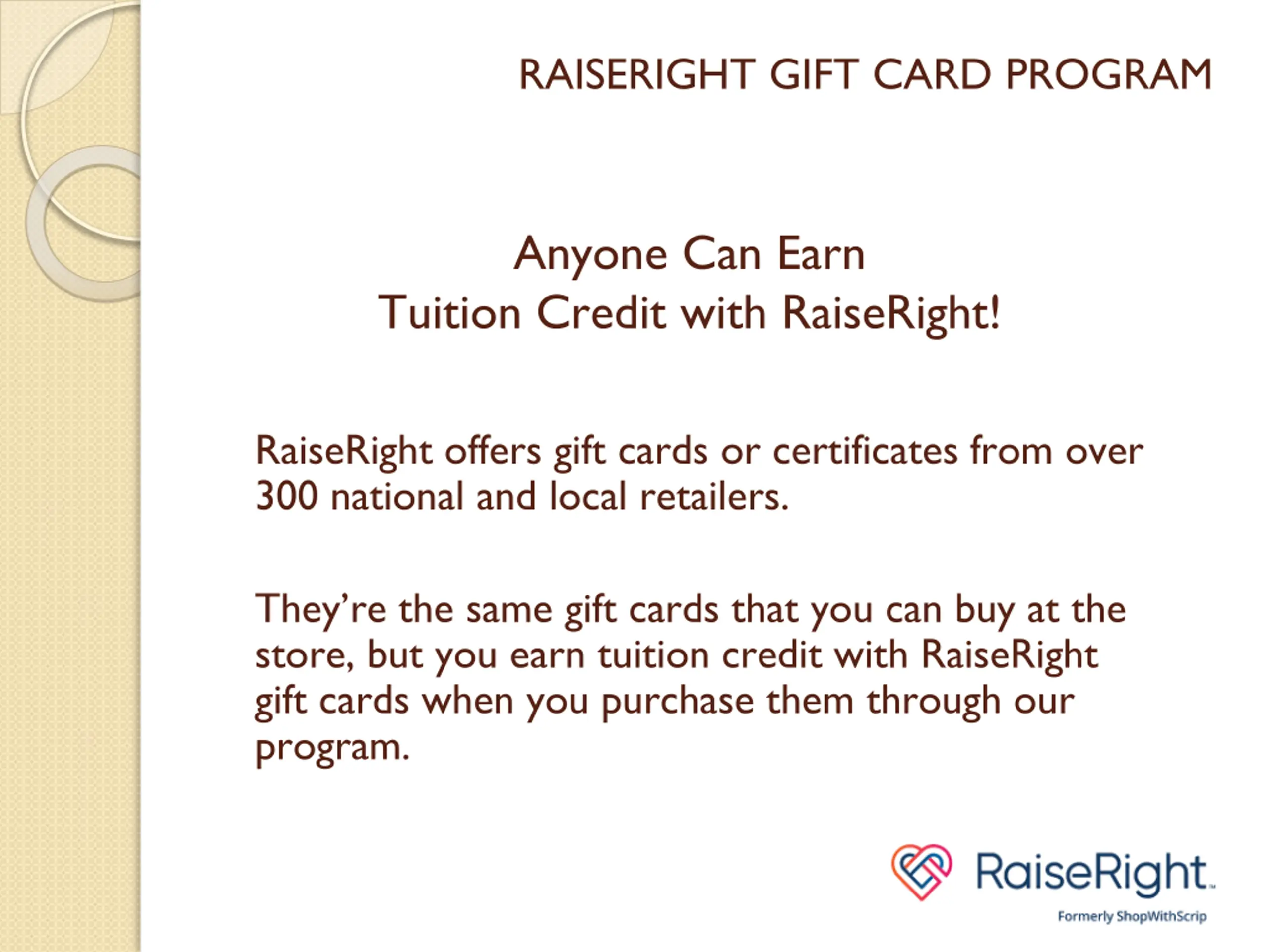 RAISERIGHT GIFT CARD PROGRAM Anyone Can Earn Tuition Credit with RaiseRight! RaiseRight offers gift cards or certificates from over 300 national and local retailers. They re the same gift cards that you can buy at the store, but you earn tuition credit with RaiseRight gift cards when you purchase them through our program.
