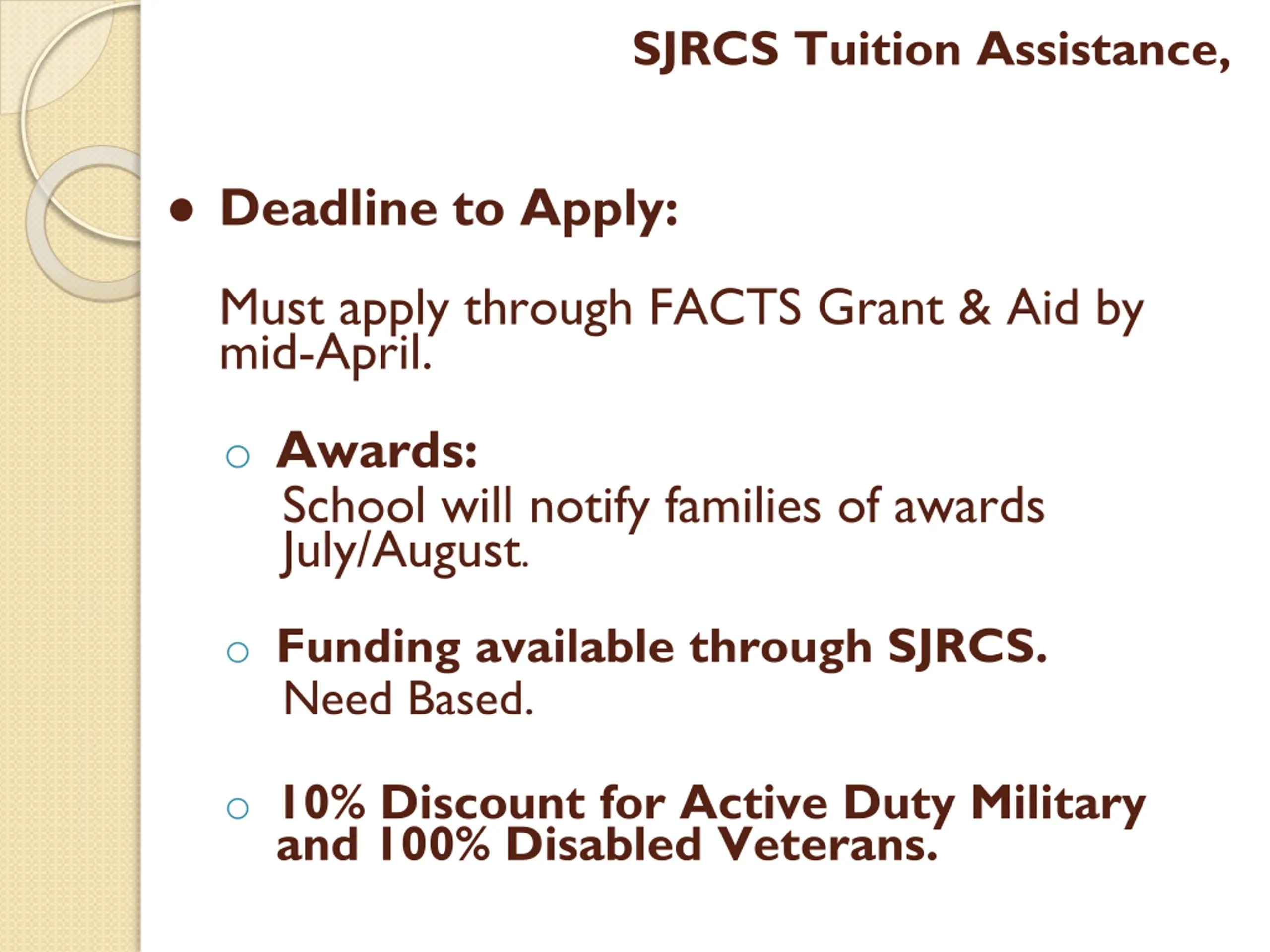 SJRCS Tuition Assistance, Deadline to Apply: Must apply through FACTS Grant & Aid by mid-April. o Awards: School will notify families of awards July/August. o Funding available through SJRCS. Need Based. o 10% Discount for Active Duty Military and 100% Disabled Veterans.