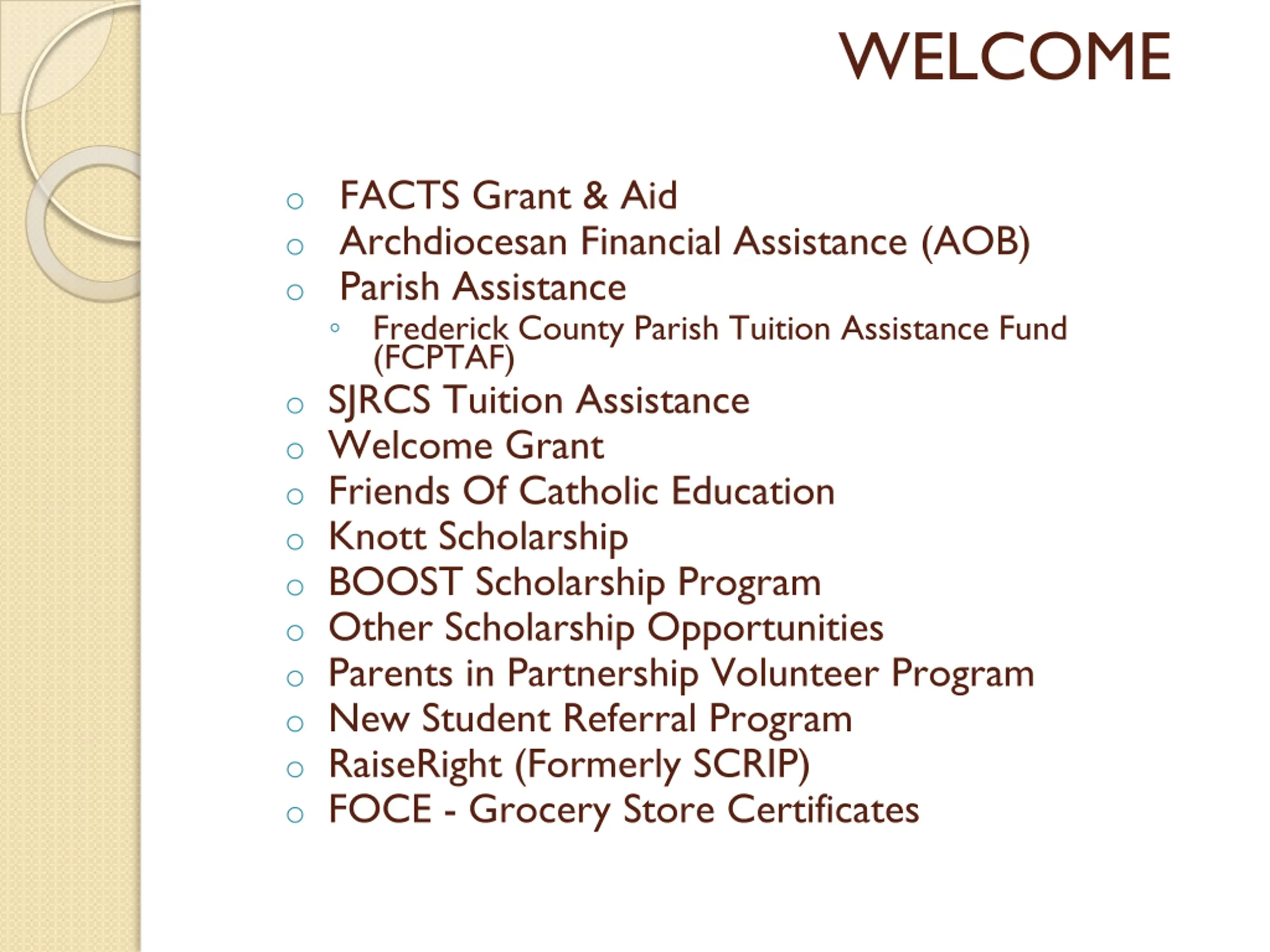 WELCOME o FACTS Grant & Aid o Archdiocesan Financial Assistance (AOB) o Parish Assistance Frederick County Parish Tuition Assistance Fund (FCPTAF) o SJRCS Tuition Assistance o Welcome Grant o Friends Of Catholic Education o Knott Scholarship o BOOST Scholarship Program o Other Scholarship Opportunities o Parents in Partnership Volunteer Program o New Student Referral Program o RaiseRight (Formerly SCRIP) o FOCE - Grocery Store Certificates