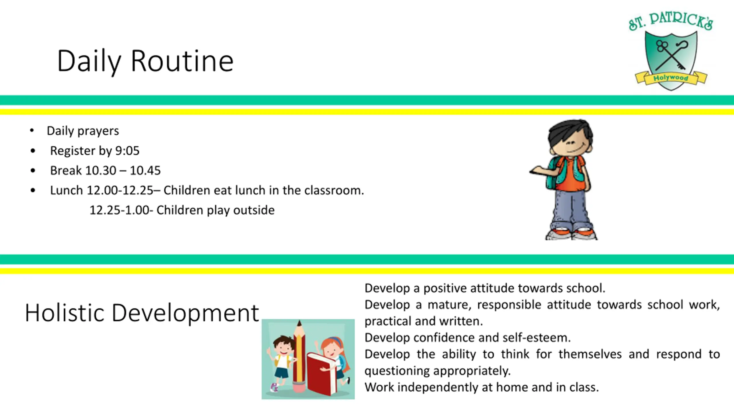 Daily Routine Daily prayers Register by 9:05 Break 10.30 10.45 Lunch 12.00-12.25 Children eat lunch in the classroom. 12.25-1.00- Children play outside Develop a positive attitude towards school. Develop a mature, responsible attitude towards school work, practical and written. Develop confidence and self-esteem. Develop the ability to think for themselves and respond to questioning appropriately. Work independently at home and in class. Holistic Development