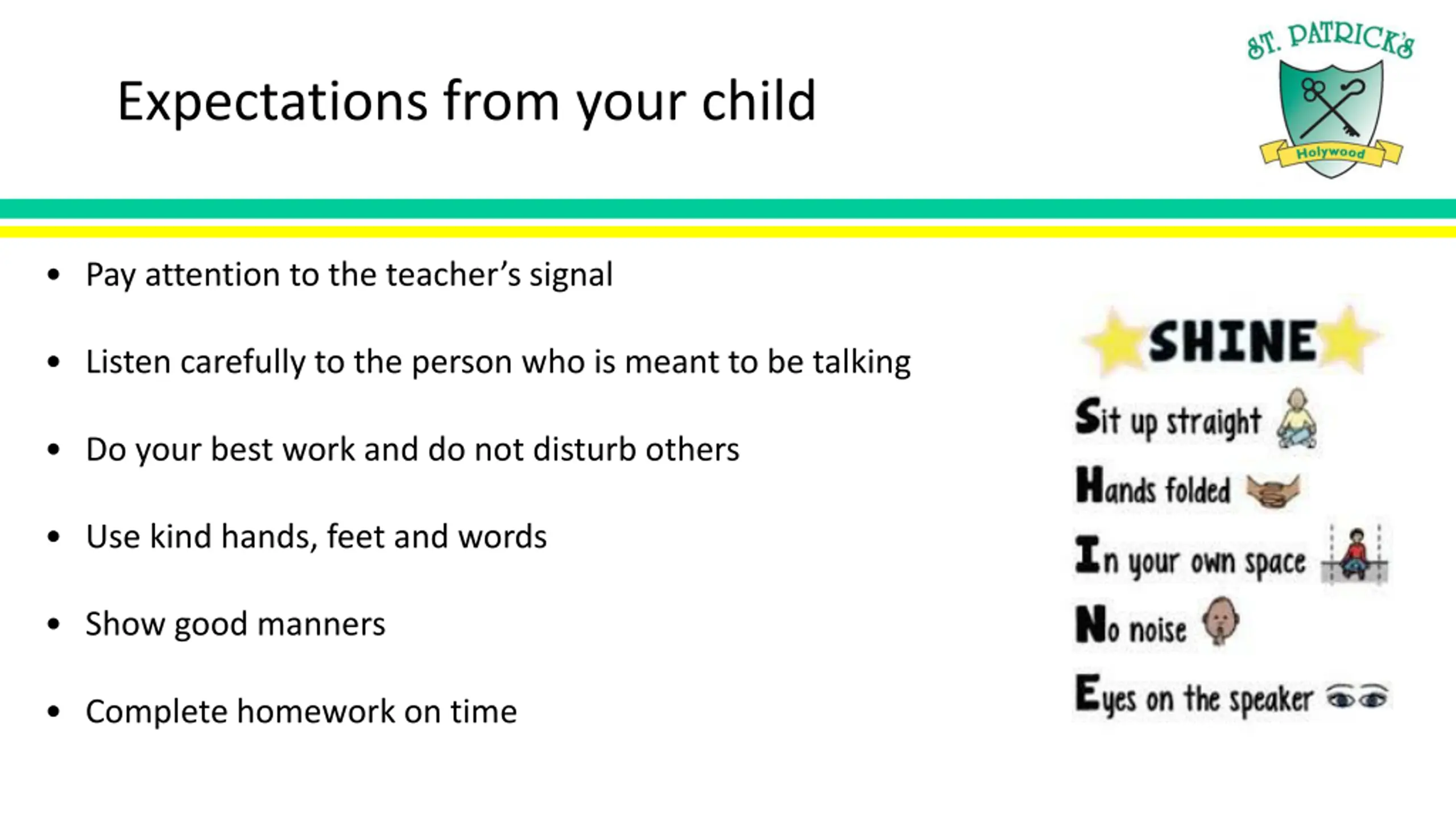 Expectations from your child Pay attention to the teacher s signal Listen carefully to the person who is meant to be talking Do your best work and do not disturb others Use kind hands, feet and words Show good manners Complete homework on time