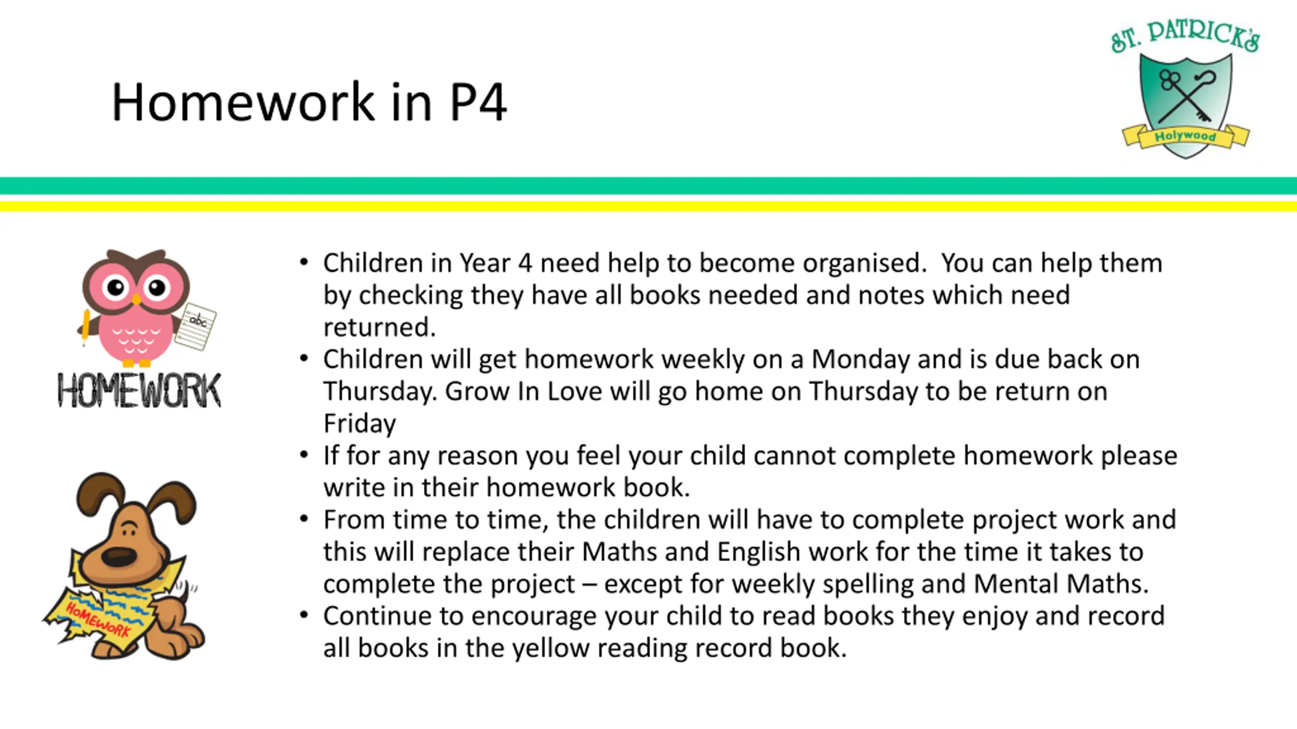 Homework in P4 Children in Year 4 need help to become organised. You can help them by checking they have all books needed and notes which need returned. Children will get homework weekly on a Monday and is due back on Thursday. Grow In Love will go home on Thursday to be return on Friday If for any reason you feel your child cannot complete homework please write in their homework book. From time to time, the children will have to complete project work and this will replace their Maths and English work for the time it takes to complete the project except for weekly spelling and Mental Maths. Continue to encourage your child to read books they enjoy and record all books in the yellow reading record book.