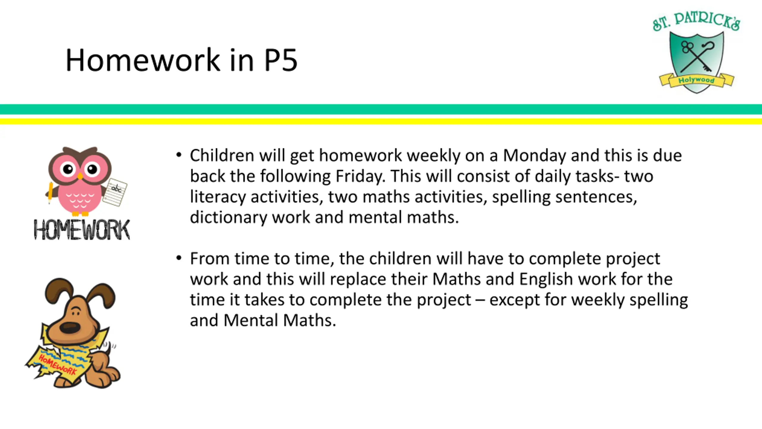 Homework in P5 Children will get homework weekly on a Monday and this is due back the following Friday. This will consist of daily tasks- two literacy activities, two maths activities, spelling sentences, dictionary work and mental maths. From time to time, the children will have to complete project work and this will replace their Maths and English work for the time it takes to complete the project except for weekly spelling and Mental Maths.
