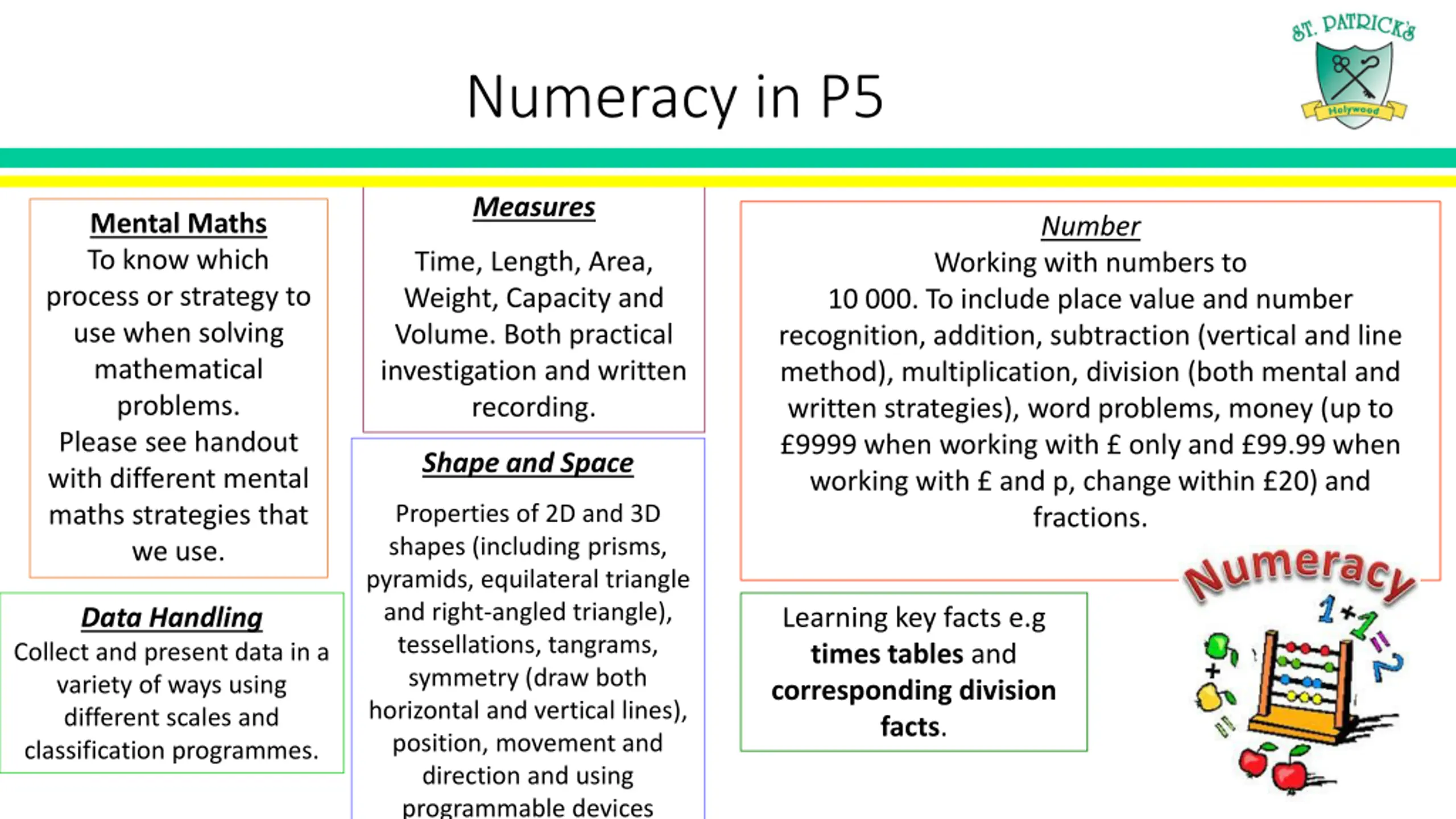 Numeracy in P5 Measures Mental Maths To know which process or strategy to use when solving mathematical problems. Please see handout with different mental maths strategies that we use. Number Time, Length, Area, Weight, Capacity and Volume. Both practical investigation and written recording. Working with numbers to 10 000. To include place value and number recognition, addition, subtraction (vertical and line method), multiplication, division (both mental and written strategies), word problems, money (up to 9999 when working with only and 99.99 when working with and p, change within 20) and fractions. Shape and Space Properties of 2D and 3D shapes (including prisms, pyramids, equilateral triangle and right-angled triangle), tessellations, tangrams, symmetry (draw both horizontal and vertical lines), position, movement and direction and using programmable devices Data Handling Collect and present data in a variety of ways using different scales and classification programmes. Learning key facts e.g times tables and corresponding division facts.