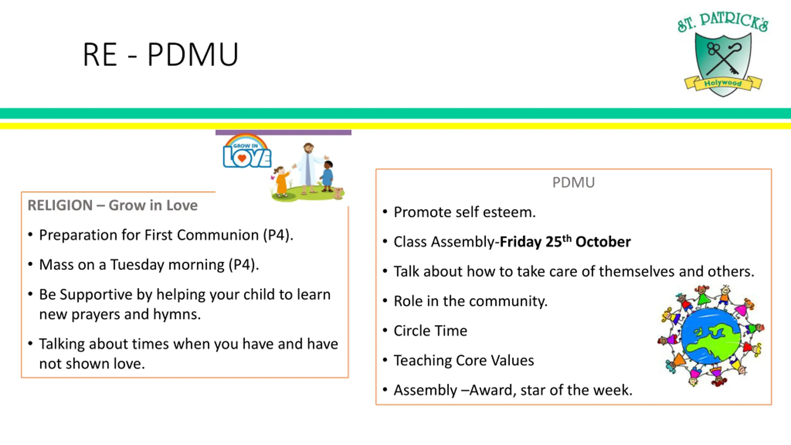 RE - PDMU PDMU RELIGION Grow in Love Promote self esteem. Preparation for First Communion (P4). Class Assembly-Friday 25th October Mass on a Tuesday morning (P4). Talk about how to take care of themselves and others. Be Supportive by helping your child to learn new prayers and hymns. Role in the community. Circle Time Talking about times when you have and have not shown love. Teaching Core Values Assembly Award, star of the week.