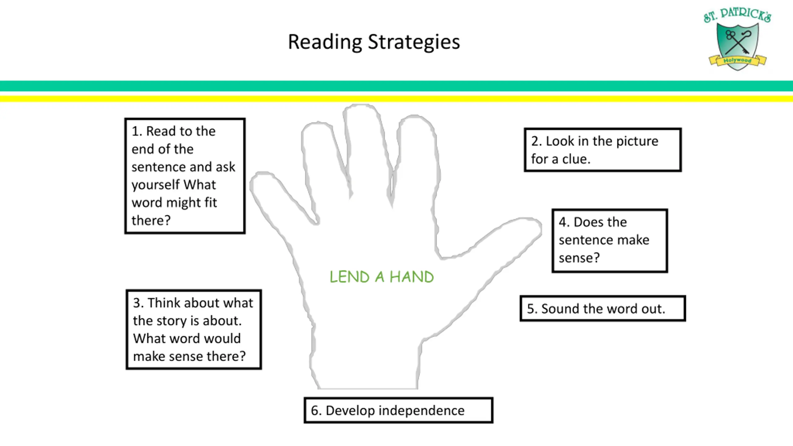 Reading Strategies 1. Read to the end of the sentence and ask yourself What word might fit there? 2. Look in the picture for a clue. 4. Does the sentence make sense? LEND A HAND 3. Think about what the story is about. What word would make sense there? 5. Sound the word out. 6. Develop independence
