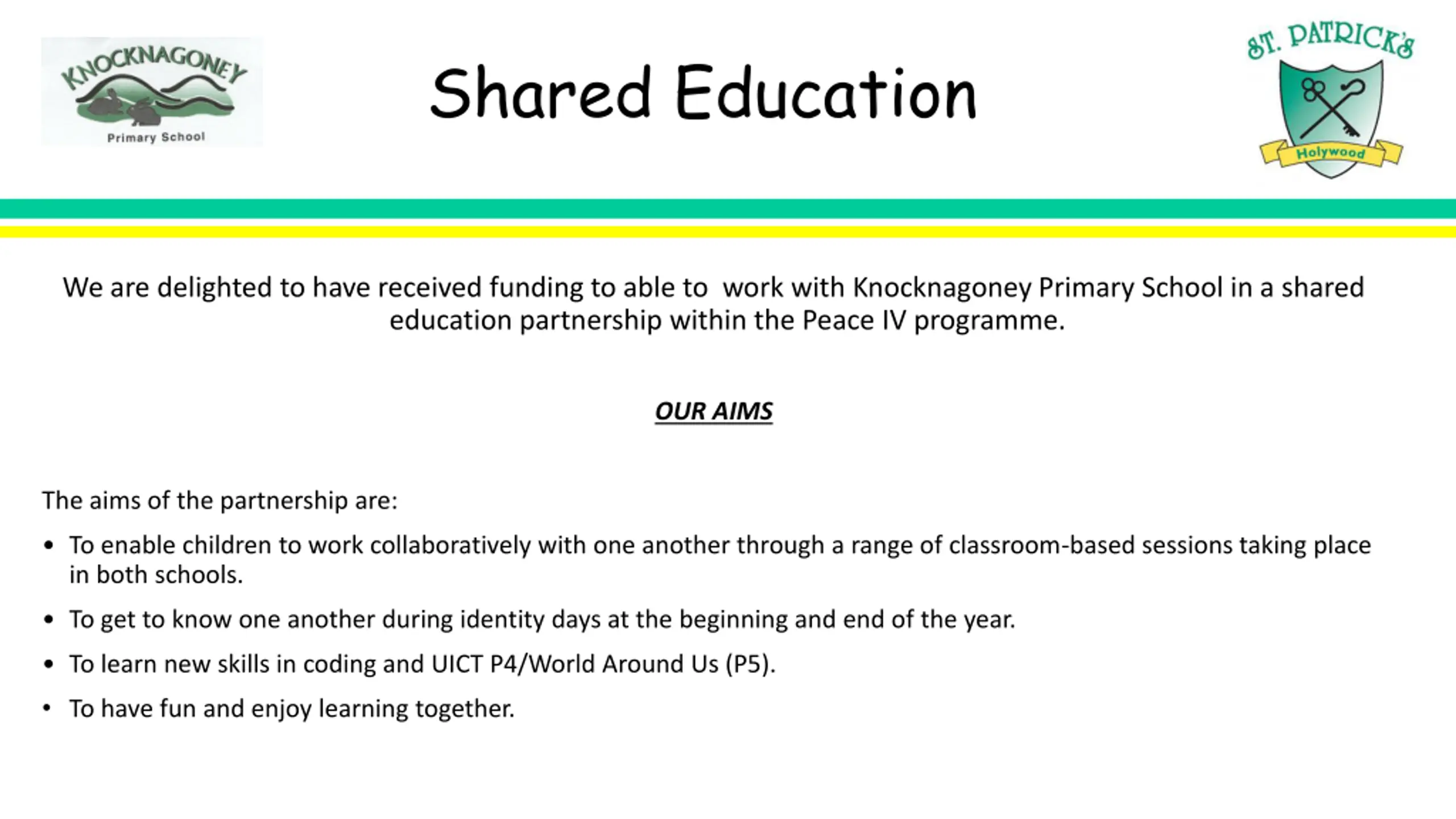 Shared Education We are delighted to have received funding to able to work with Knocknagoney Primary School in a shared education partnership within the Peace IV programme. OUR AIMS The aims of the partnership are: To enable children to work collaboratively with one another through a range of classroom-based sessions taking place in both schools. To get to know one another during identity days at the beginning and end of the year. To learn new skills in coding and UICT P4/World Around Us (P5). To have fun and enjoy learning together.