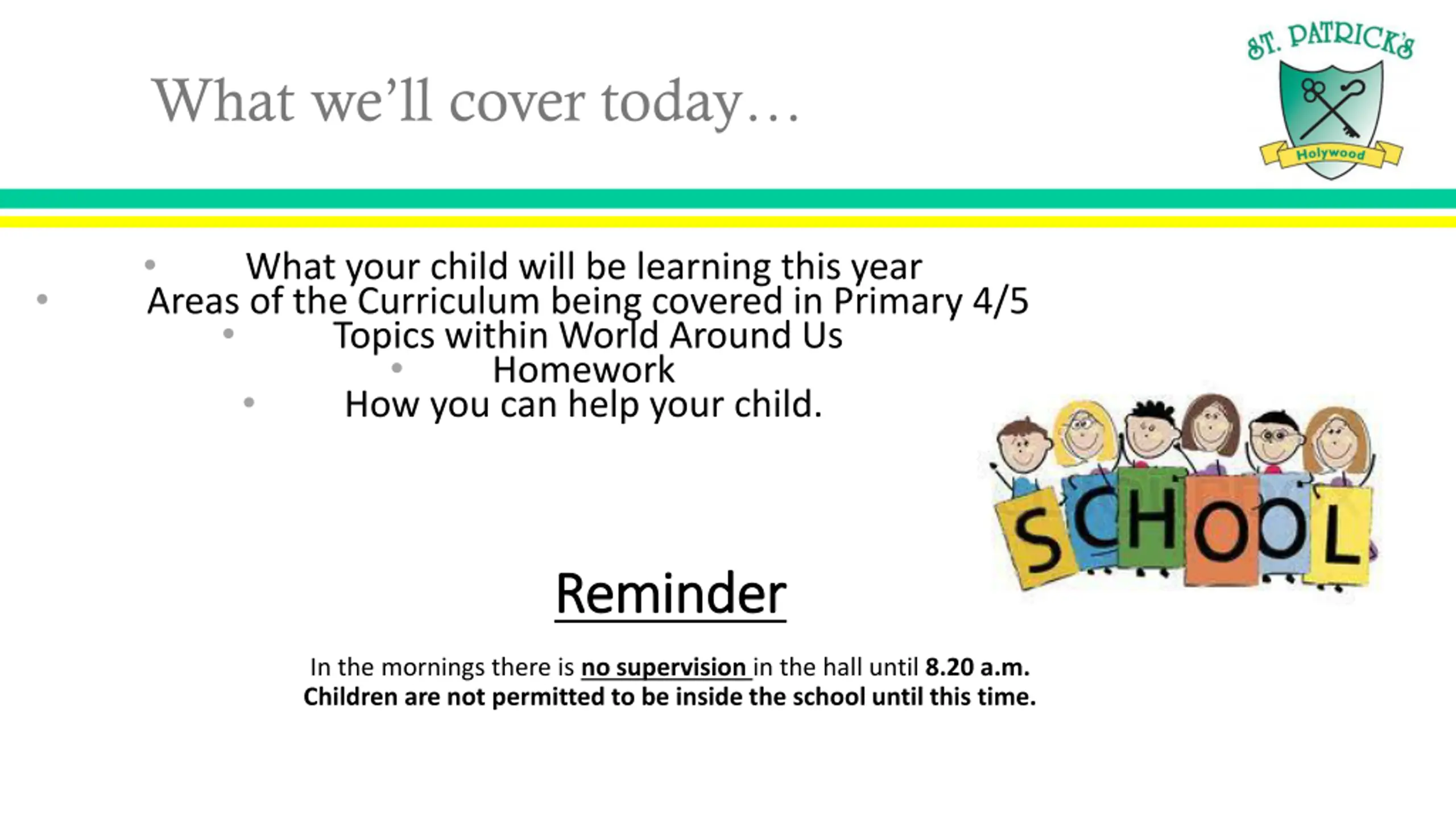What well cover today Areas of the Curriculum being covered in Primary 4/5 Topics within World Around Us Homework How you can help your child. What your child will be learning this year Reminder Reminder In the mornings there is no supervision in the hall until 8.20 a.m. Children are not permitted to be inside the school until this time.