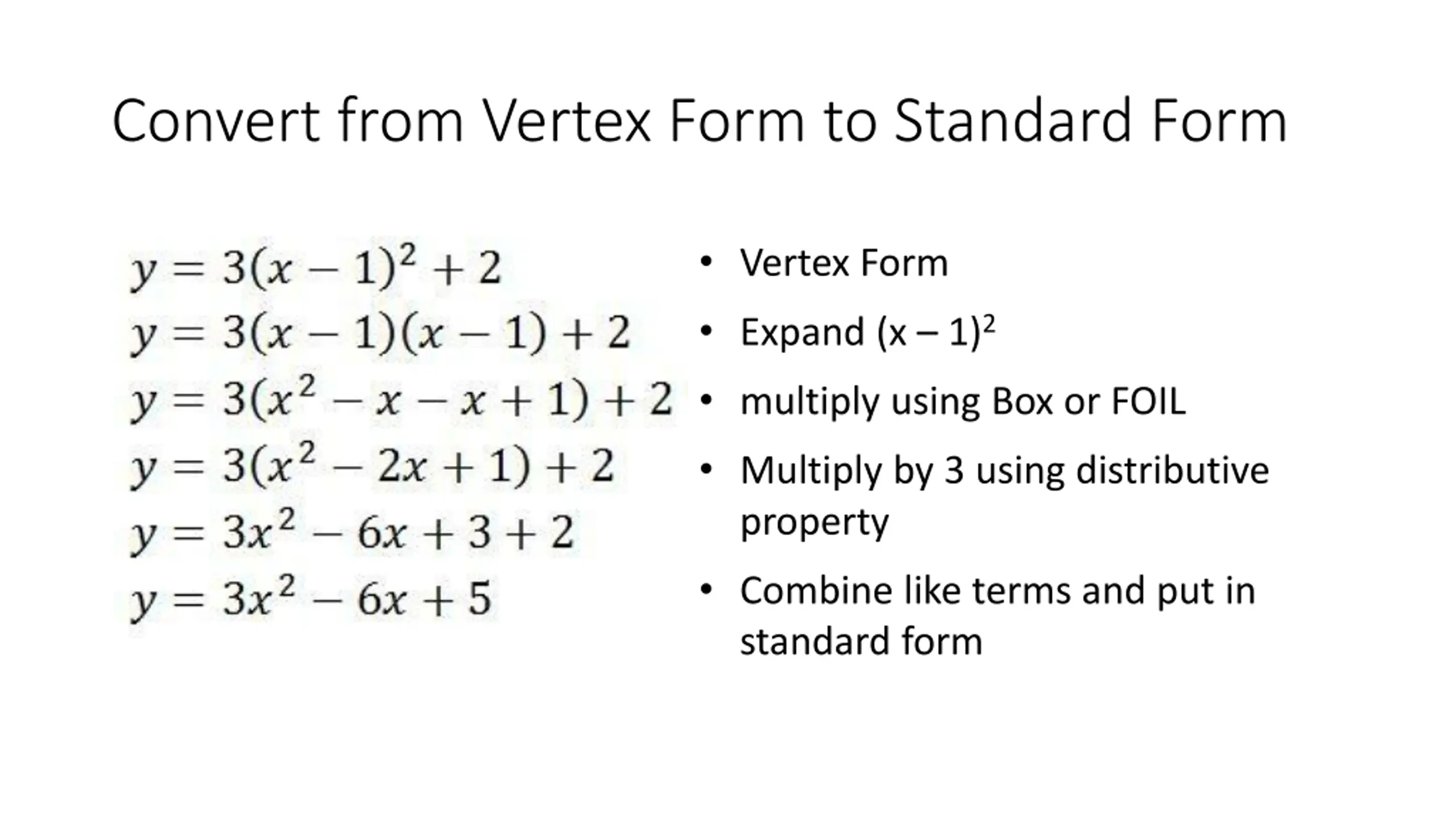 Convert from Vertex Form to Standard Form Vertex Form Expand (x 1)2 multiply using Box or FOIL Multiply by 3 using distributive property Combine like terms and put in standard form