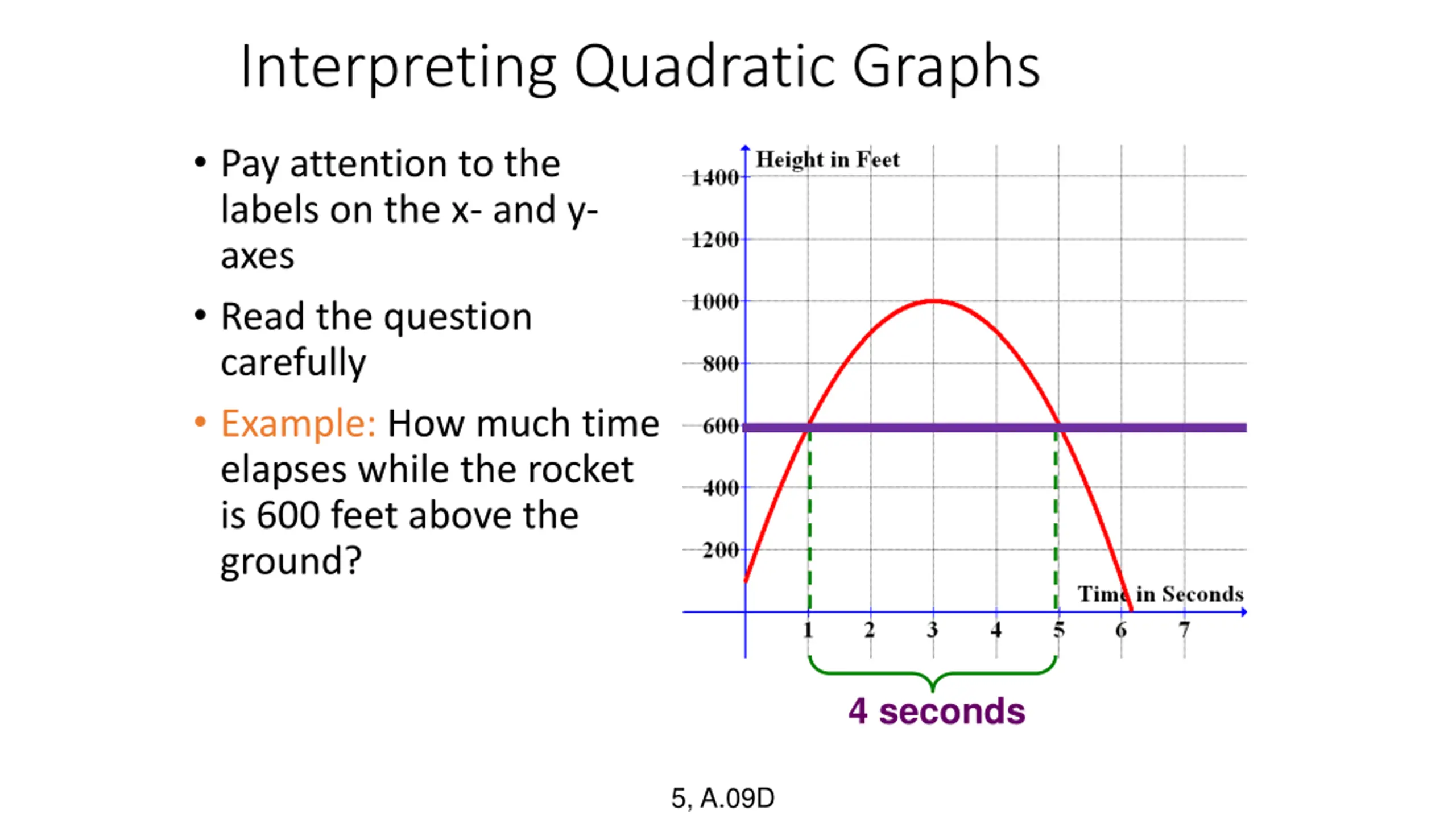 Interpreting Quadratic Graphs Pay attention to the labels on the x- and y- axes Read the question carefully Example: How much time elapses while the rocket is 600 feet above the ground? 4 seconds 5, A.09D