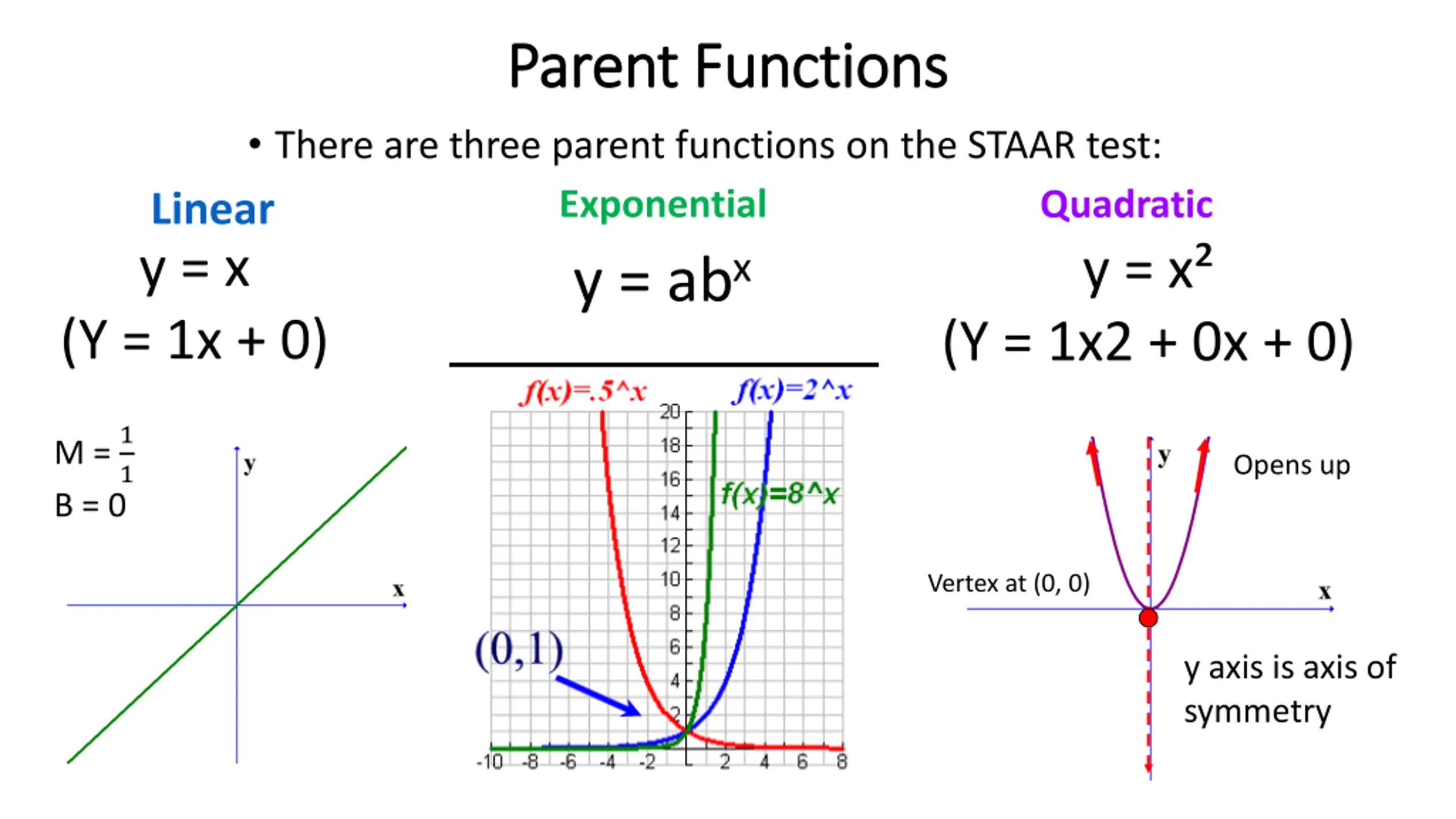 Parent Functions Parent Functions There are three parent functions on the STAAR test: Linear y = x (Y = 1x + 0) Exponential y = abx Quadratic y = x (Y = 1x2 + 0x + 0) M = 1 B = 0 Opens up 1 Vertex at (0, 0) y axis is axis of symmetry