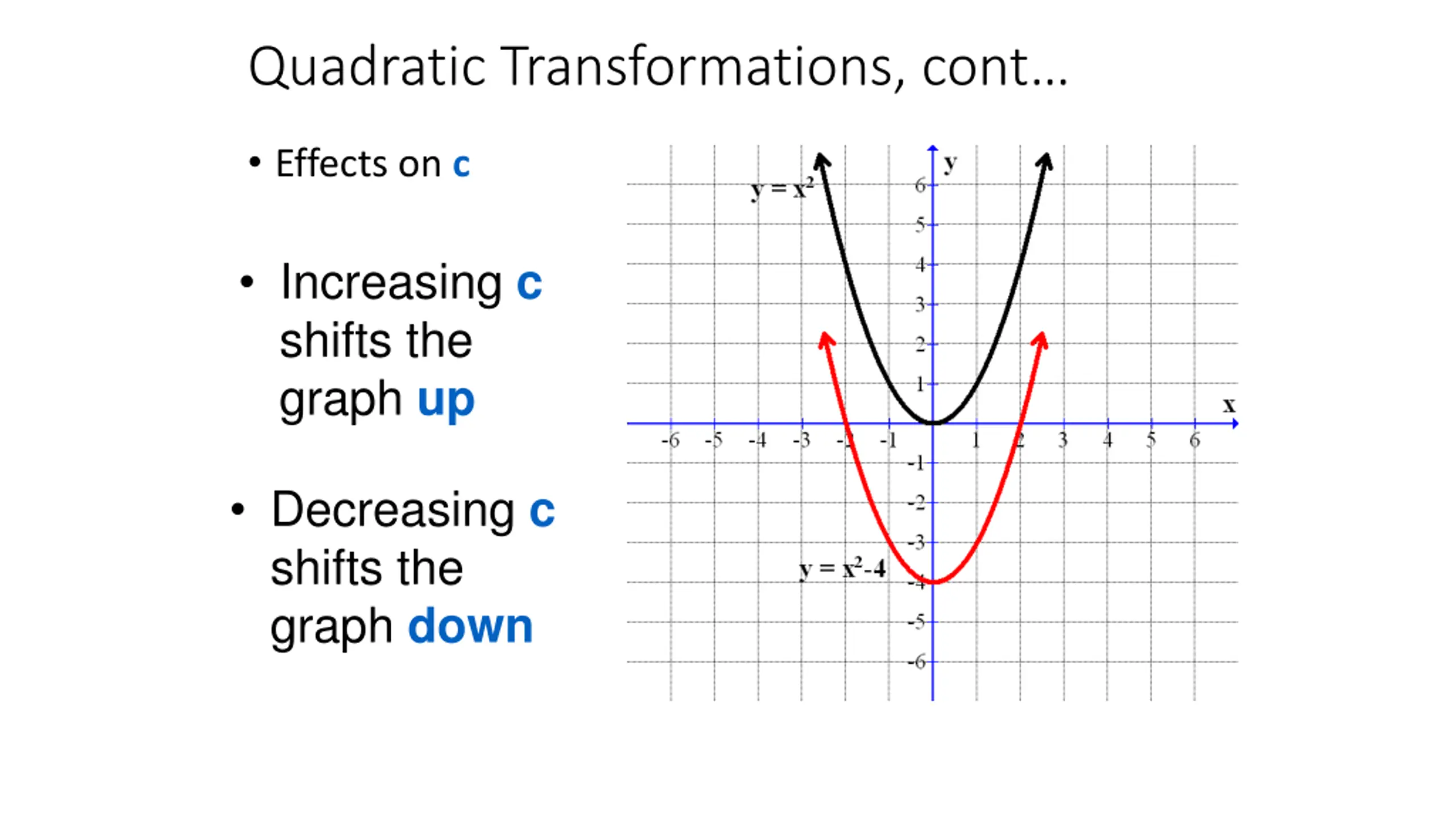 Quadratic Transformations, cont Effects on c Increasing c shifts the graph up Decreasing c shifts the graph down