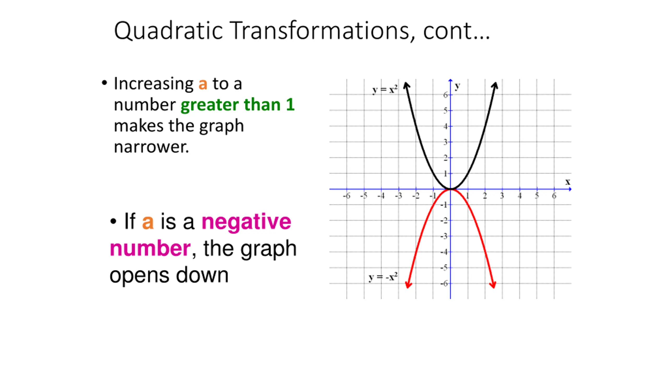 Quadratic Transformations, cont Increasing a to a number greater than 1 makes the graph narrower. If a is a negative number, the graph opens down