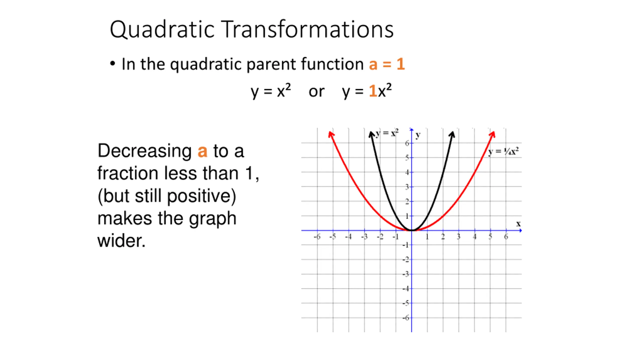 Quadratic Transformations In the quadratic parent function a = 1 y = x or y = 1x Decreasing a to a fraction less than 1, (but still positive) makes the graph wider.