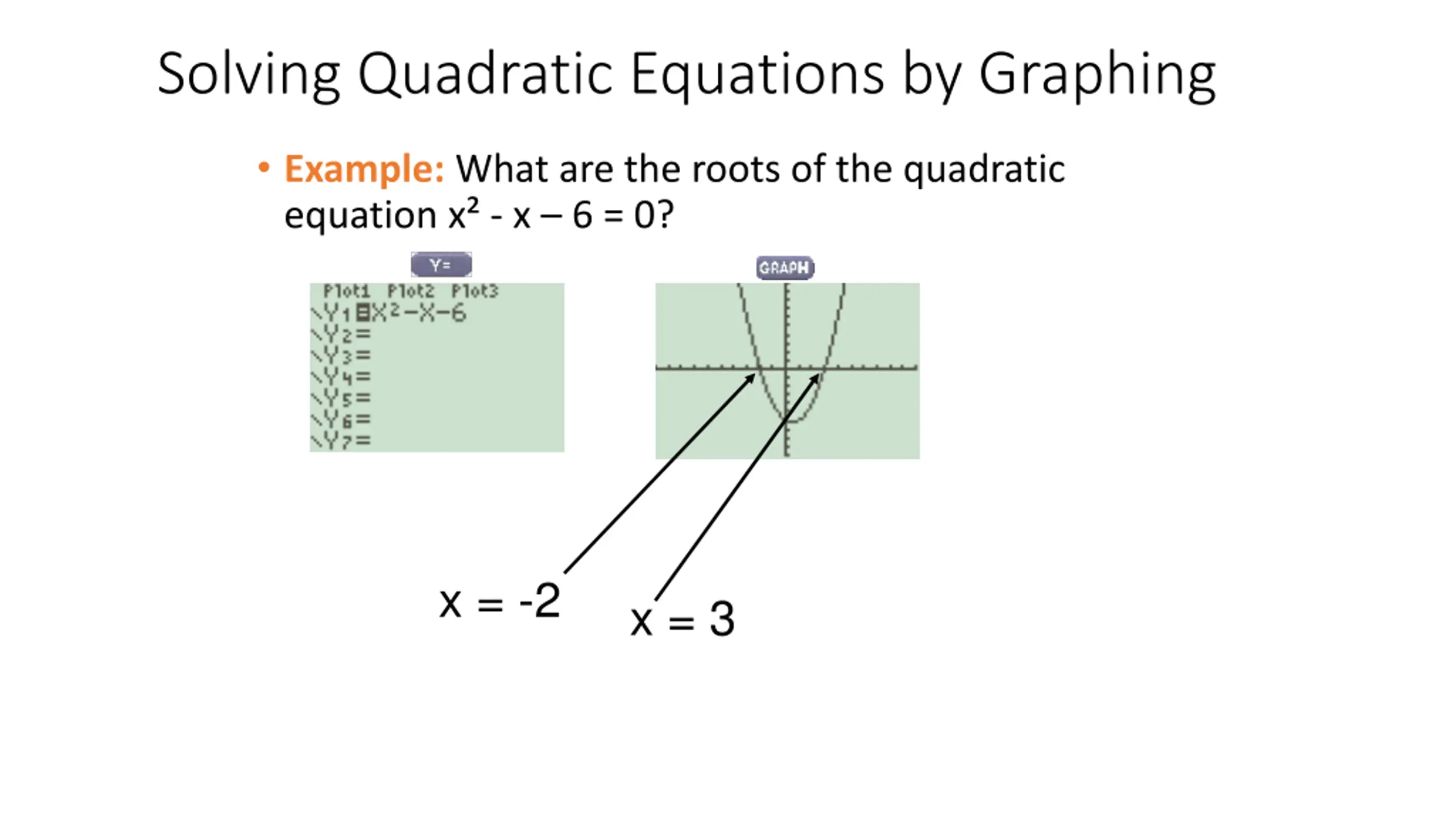 Solving Quadratic Equations by Graphing Example: What are the roots of the quadratic equation x - x 6 = 0? x = -2 x = 3