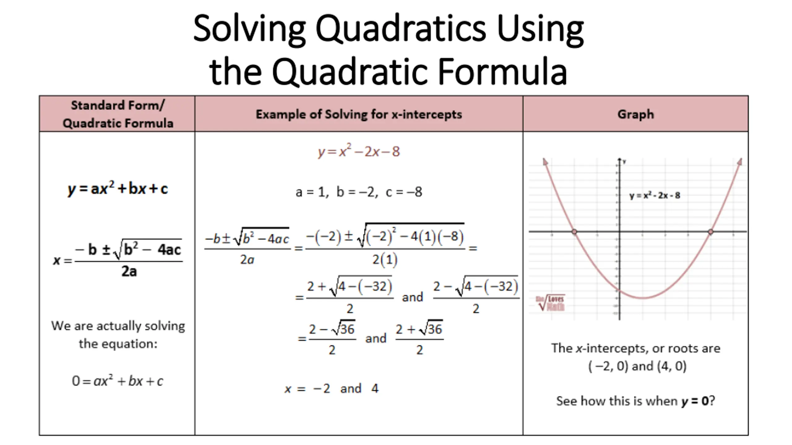 Solving Quadratic Equations The solutions,roots, x-intercepts or zeros of a quadratic equation are the points where the parabola crosses the x-axis
