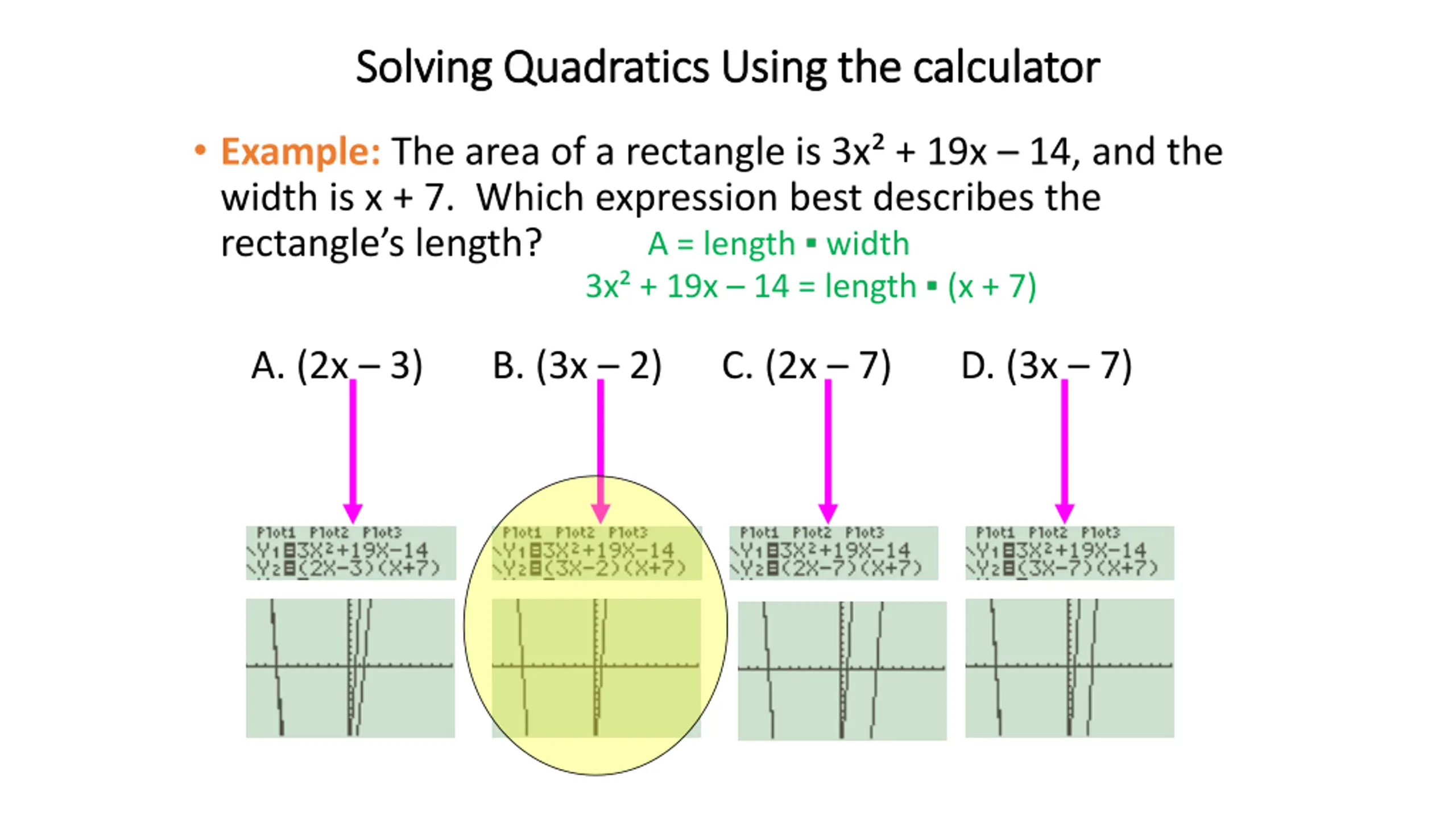 Solving Quadratics Using the calculator Solving Quadratics Using the calculator Example: The area of a rectangle is 3x + 19x 14, and the width is x + 7. Which expression best describes the rectangle s length? A. (2x 3) B. (3x 2) C. (2x 7) D. (3x 7) A = length width 3x + 19x 14 = length (x + 7)