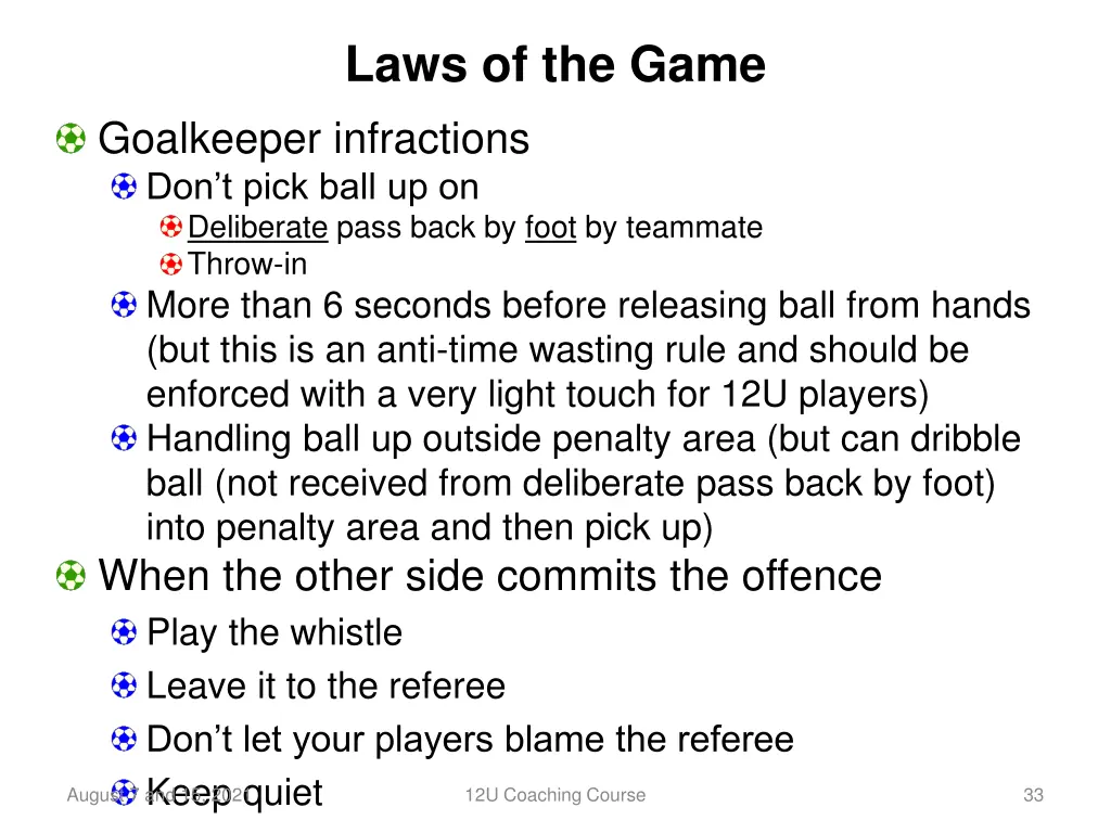 Appendix 1 Laws of the Game What players (and coaches) need to know Ball in and out of play if part of ball is on the line, it is in play; a ball that hasn t fully crossed the line is not out Throw-in technique arms straight, ball over head Direct v. indirect kick 2nd touch before goal can be scored; if IFK, referee will raise hand high Handling must be deliberate Basics of offside Offside position v offside Cannot be offside when receiving ball directly from goal kick, throw-in or corner Stay level with last defender (not including keeper) August 7 and 15, 2021 12U Coaching Course 32