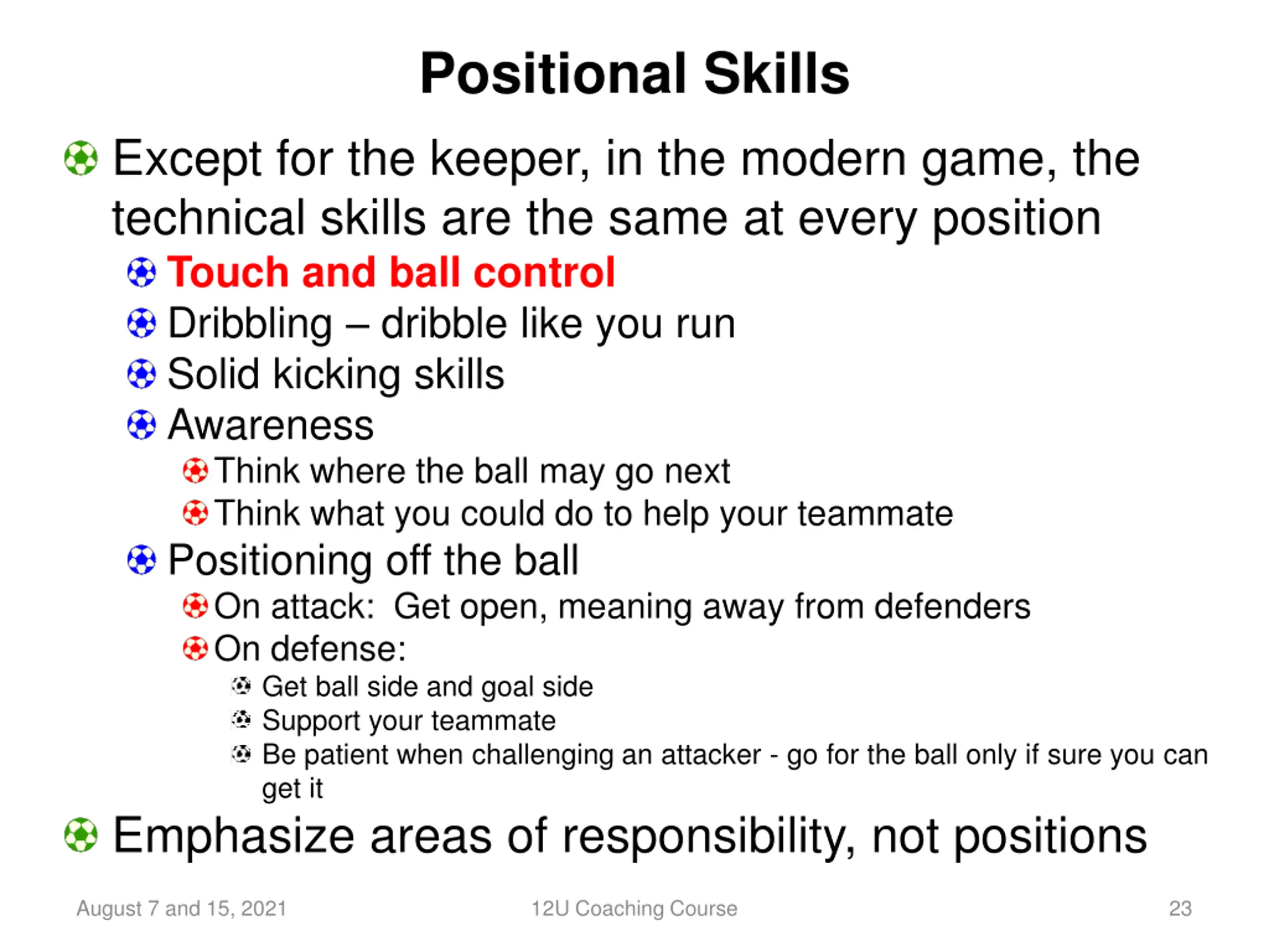 Positional Skills Except for the keeper, in the modern game, the technical skills are the same at every position Touch and ball control Dribbling dribble like you run Solid kicking skills Awareness Think where the ball may go next Think what you could do to help your teammate Positioning off the ball On attack: Get open, meaning away from defenders On defense: Get ball side and goal side Support your teammate Be patient when challenging an attacker - go for the ball only if sure you can get it Emphasize areas of responsibility, not positions August 7 and 15, 2021 12U Coaching Course 23