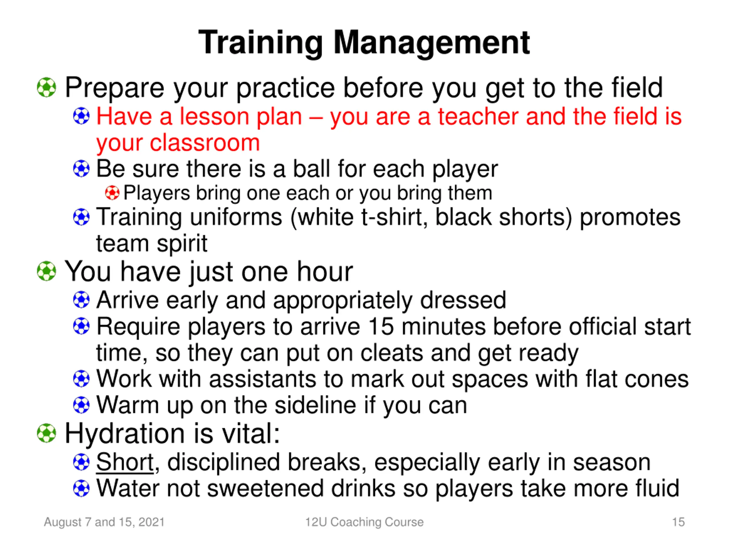 Training Management Prepare your practice before you get to the field Have a lesson plan you are a teacher and the field is your classroom Be sure there is a ball for each player Players bring one each or you bring them Training uniforms (white t-shirt, black shorts) promotes team spirit You have just one hour Arrive early and appropriately dressed Require players to arrive 15 minutes before official start time, so they can put on cleats and get ready Work with assistants to mark out spaces with flat cones Warm up on the sideline if you can Hydration is vital: Short, disciplined breaks, especially early in season Water not sweetened drinks so players take more fluid August 7 and 15, 2021 12U Coaching Course 15