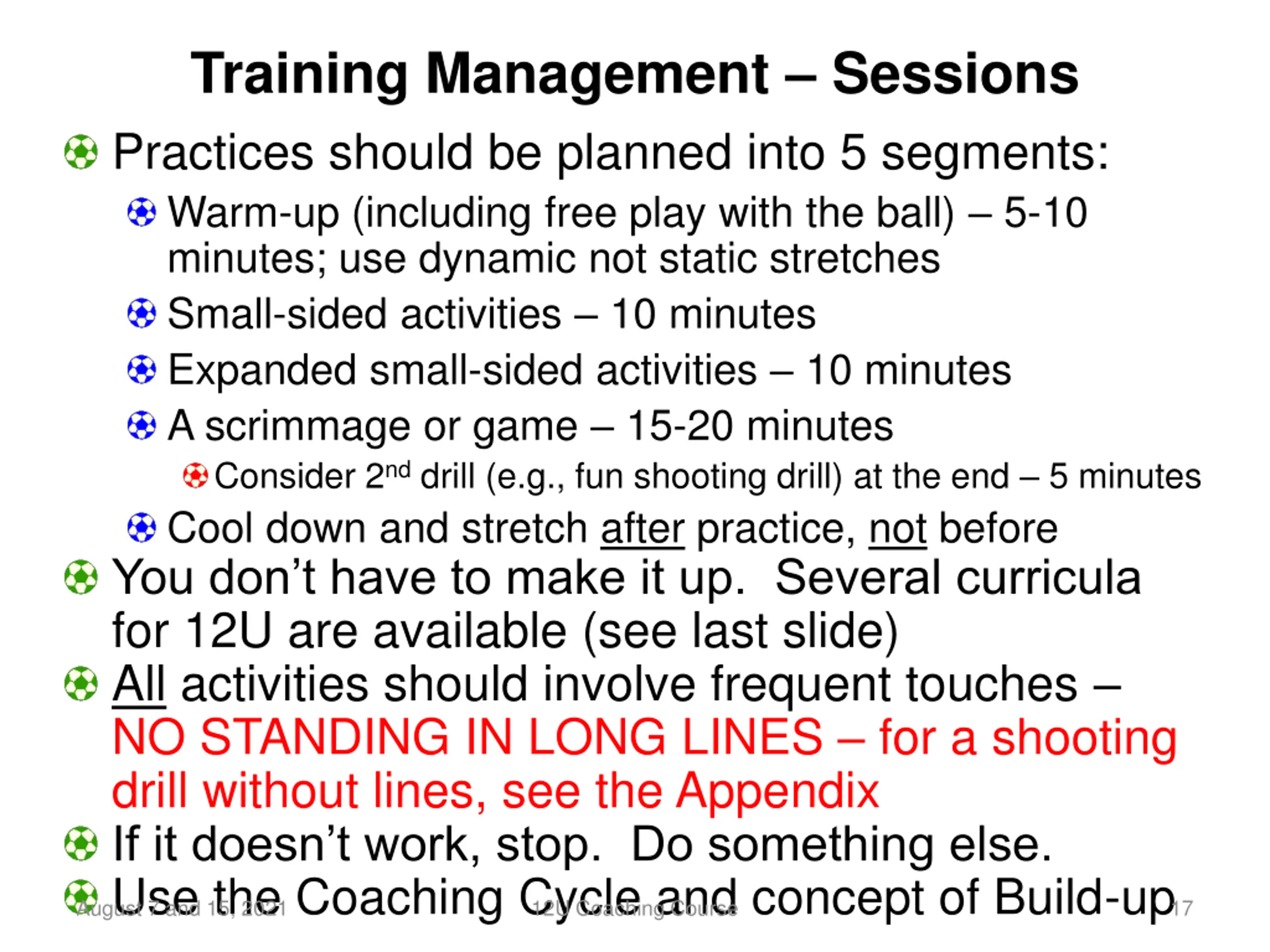 Training Management Sessions Practices should be planned into 5 segments: Warm-up (including free play with the ball) 5-10 minutes; use dynamic not static stretches Small-sided activities 10 minutes Expanded small-sided activities 10 minutes A scrimmage or game 15-20 minutes Consider 2nd drill (e.g., fun shooting drill) at the end 5 minutes Cool down and stretch after practice, not before You don t have to make it up. Several curricula for 12U are available (see last slide) All activities should involve frequent touches NO STANDING IN LONG LINES for a shooting drill without lines, see the Appendix If it doesn t work, stop. Do something else. Use the Coaching Cycle and concept of Build-up August 7 and 15, 2021 12U Coaching Course 17