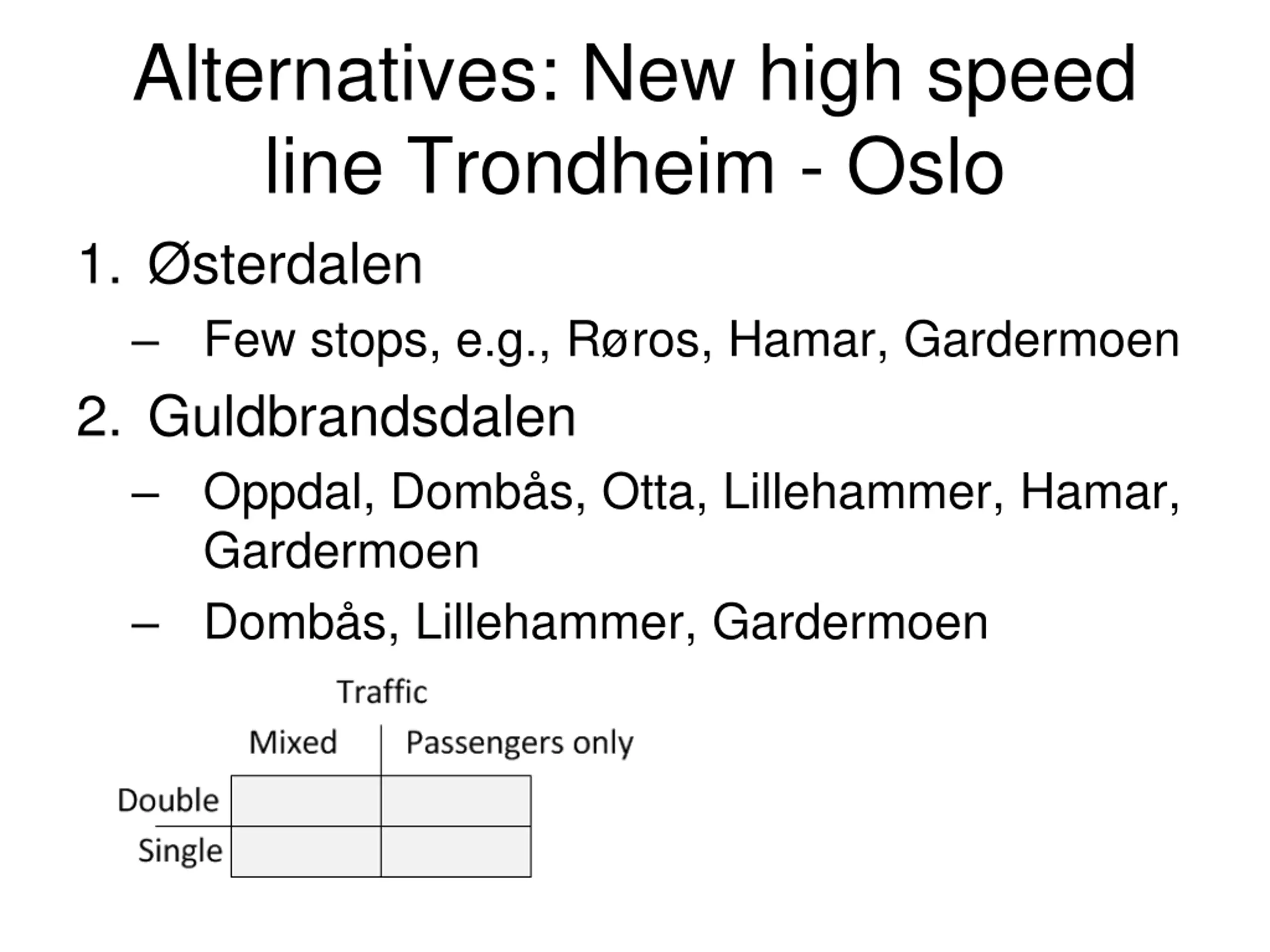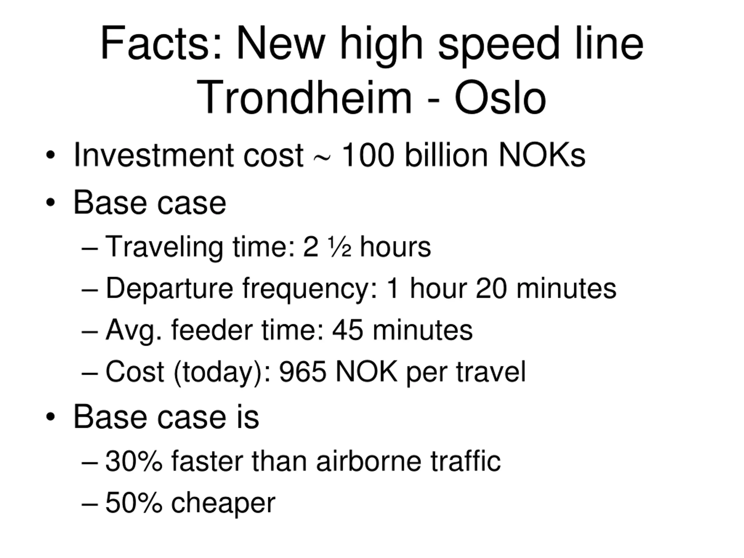Facts: New high speed line Trondheim - Oslo Investment cost 100 billion NOKs Base case Traveling time: 2 hours Departure frequency: 1 hour 20 minutes Avg. feeder time: 45 minutes Cost (today): 965 NOK per travel Base case is 30% faster than airborne traffic 50% cheaper