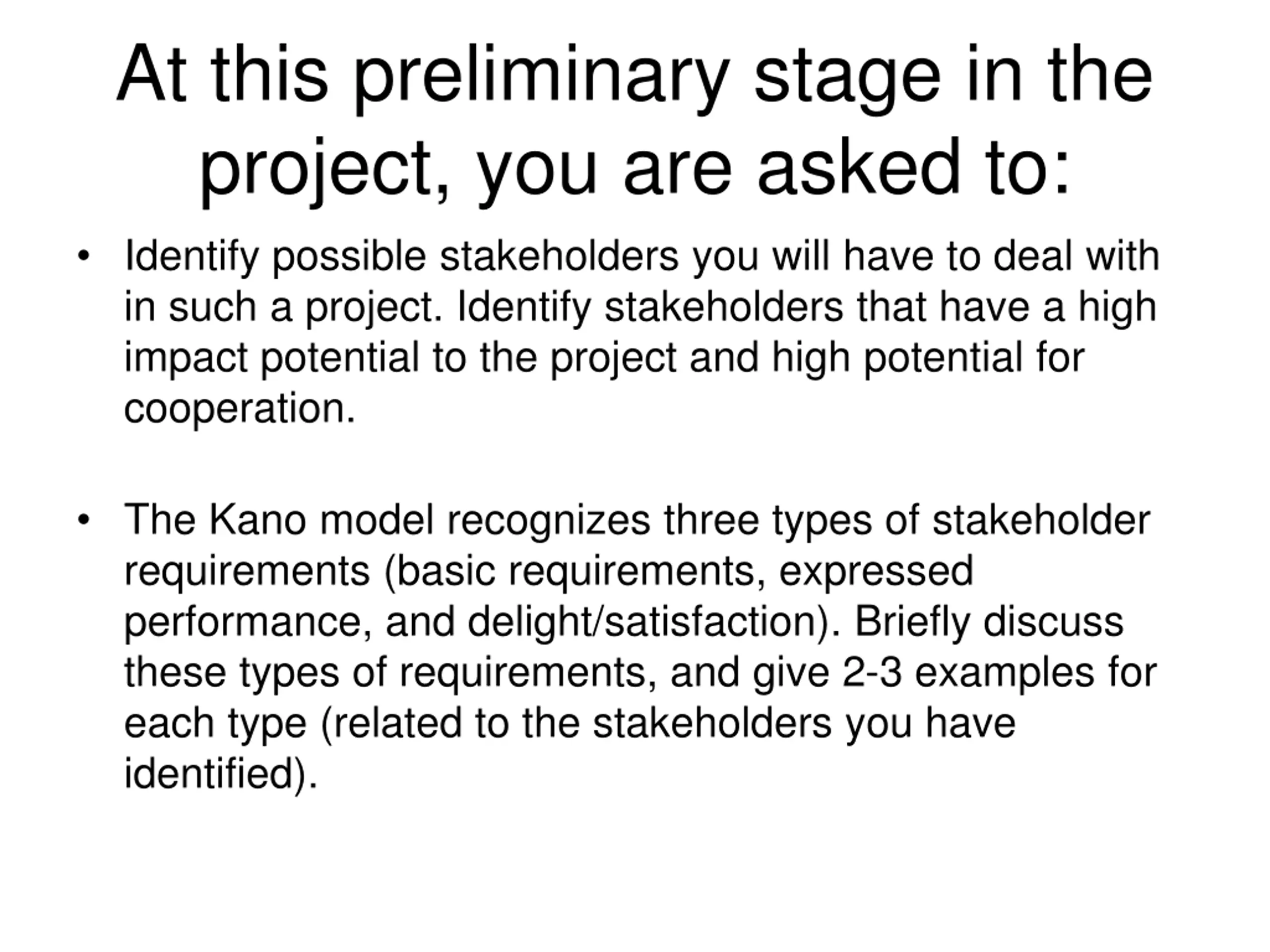At this preliminary stage in the project, you are asked to: Identify possible stakeholders you will have to deal with in such a project. Identify stakeholders that have a high impact potential to the project and high potential for cooperation. The Kano model recognizes three types of stakeholder requirements (basic requirements, expressed performance, and delight/satisfaction). Briefly discuss these types of requirements, and give 2-3 examples for each type (related to the stakeholders you have identified).