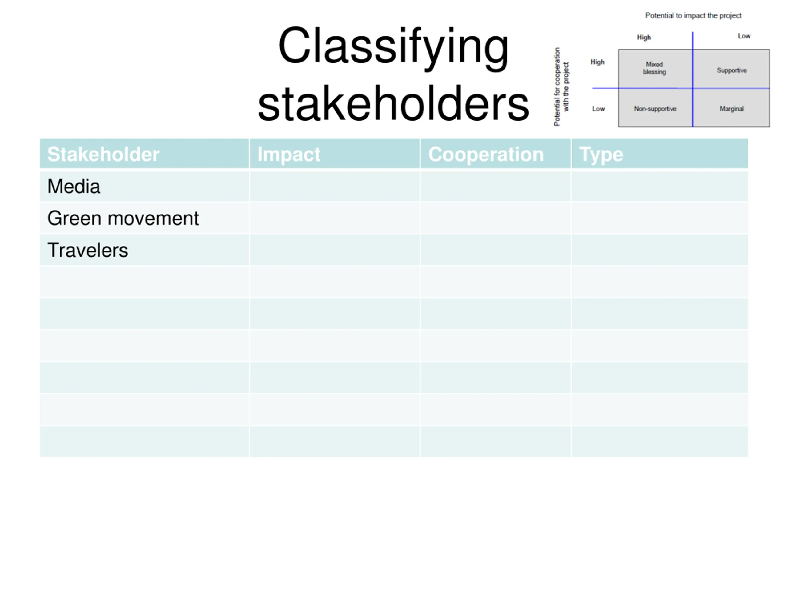 Classifying stakeholders Stakeholder Media Green movement Travelers Impact Cooperation Type