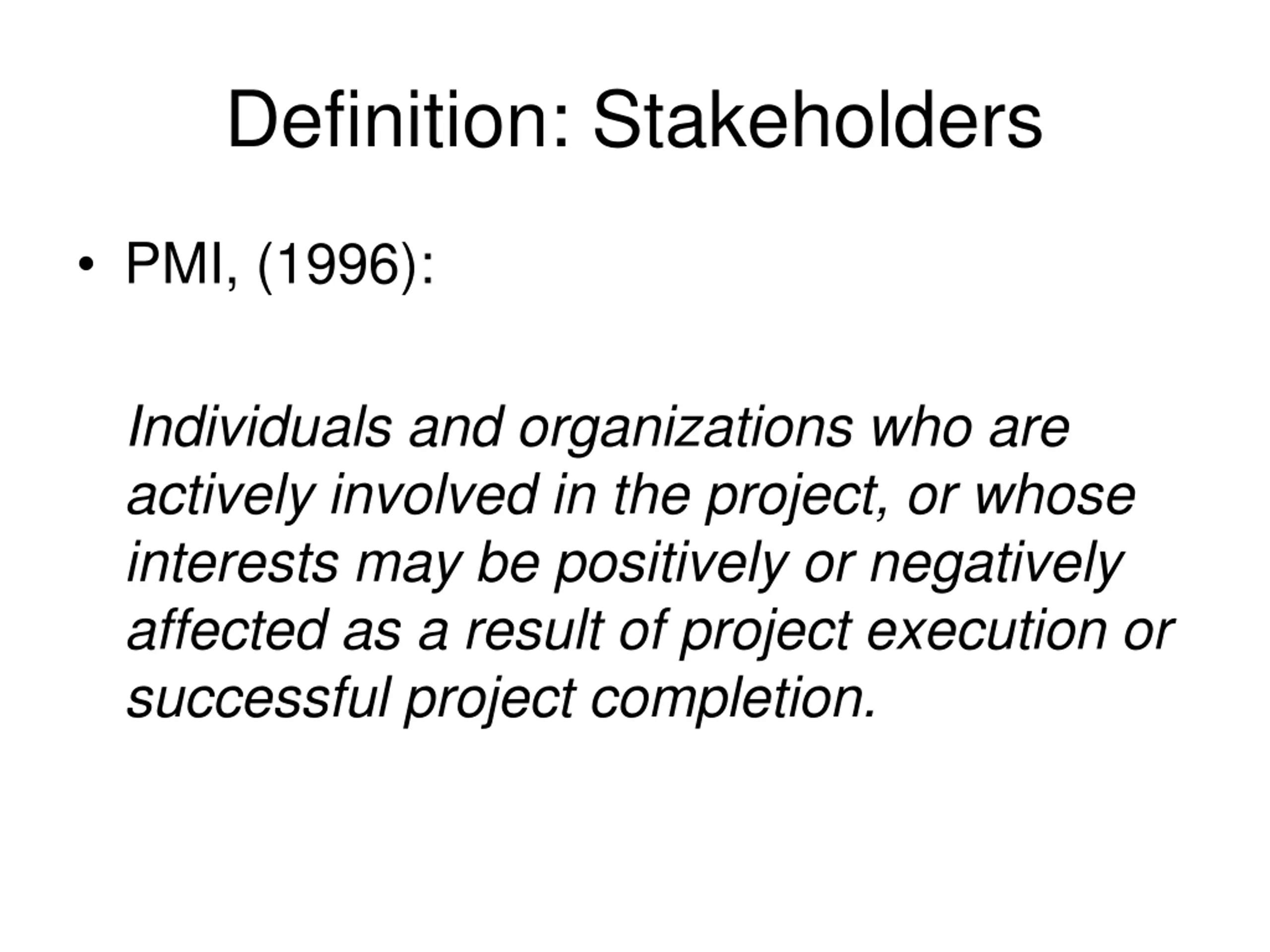 Definition: Stakeholders PMI, (1996): Individuals and organizations who are actively involved in the project, or whose interests may be positively or negatively affected as a result of project execution or successful project completion.