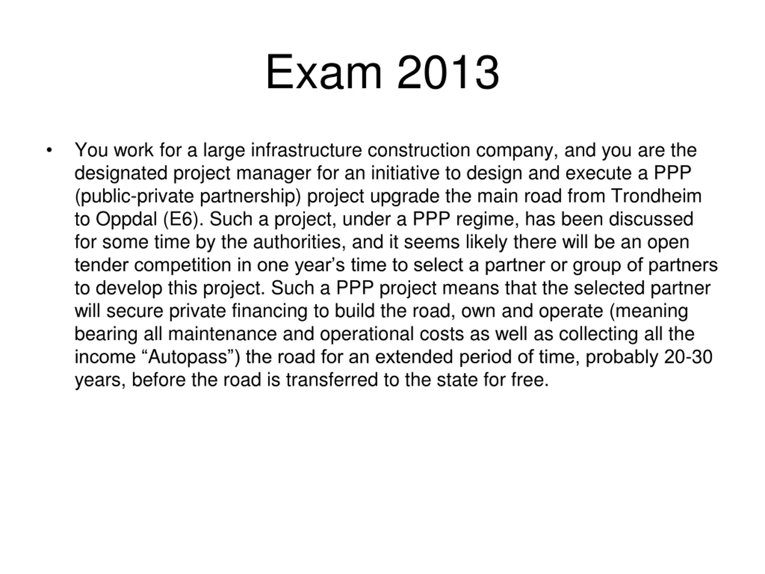 Exam 2013 You work for a large infrastructure construction company, and you are the designated project manager for an initiative to design and execute a PPP (public-private partnership) project upgrade the main road from Trondheim to Oppdal (E6). Such a project, under a PPP regime, has been discussed for some time by the authorities, and it seems likely there will be an open tender competition in one year s time to select a partner or group of partners to develop this project. Such a PPP project means that the selected partner will secure private financing to build the road, own and operate (meaning bearing all maintenance and operational costs as well as collecting all the income Autopass ) the road for an extended period of time, probably 20-30 years, before the road is transferred to the state for free.