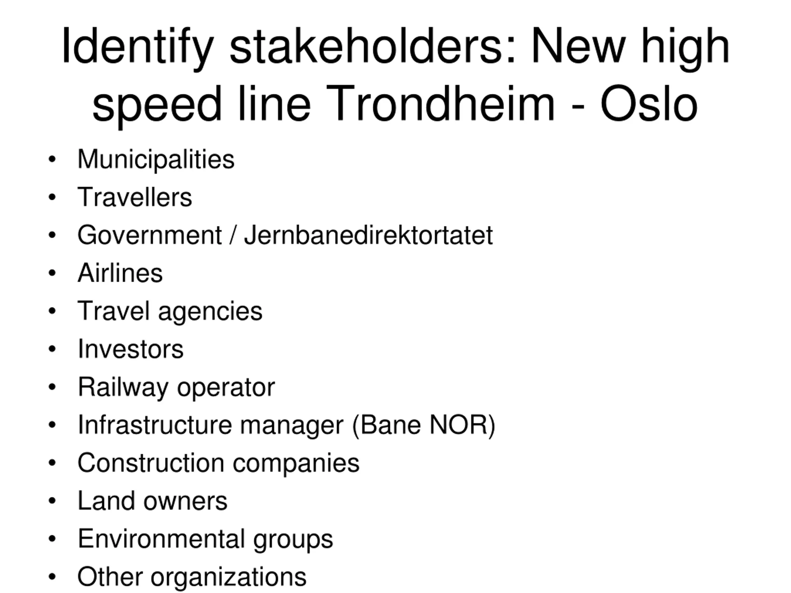Identify stakeholders: New high speed line Trondheim - Oslo Municipalities Travellers Government / Jernbanedirektortatet Airlines Travel agencies Investors Railway operator Infrastructure manager (Bane NOR) Construction companies Land owners Environmental groups Other organizations