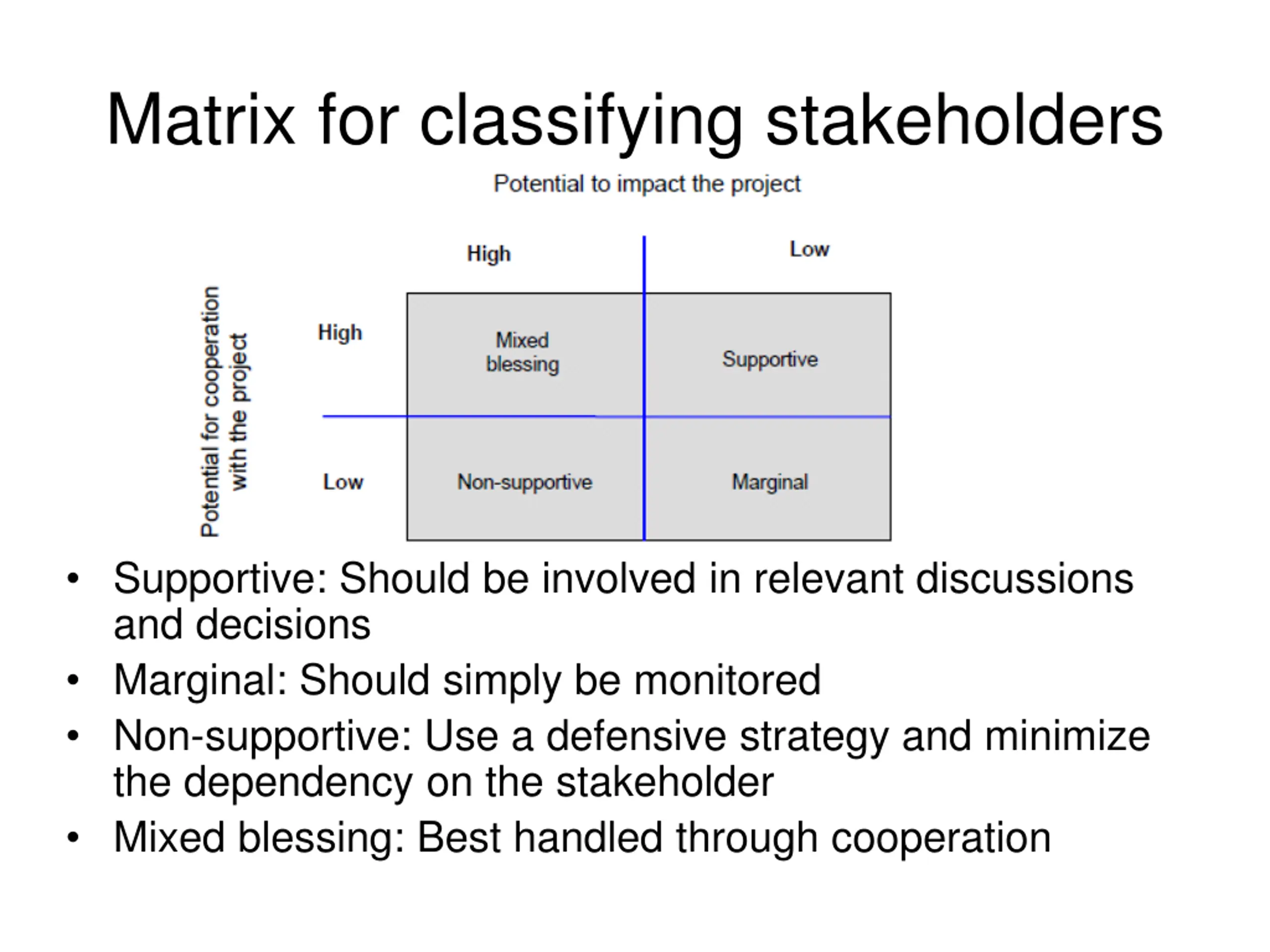 Matrix for classifying stakeholders Supportive: Should be involved in relevant discussions and decisions Marginal: Should simply be monitored Non-supportive: Use a defensive strategy and minimize the dependency on the stakeholder Mixed blessing: Best handled through cooperation
