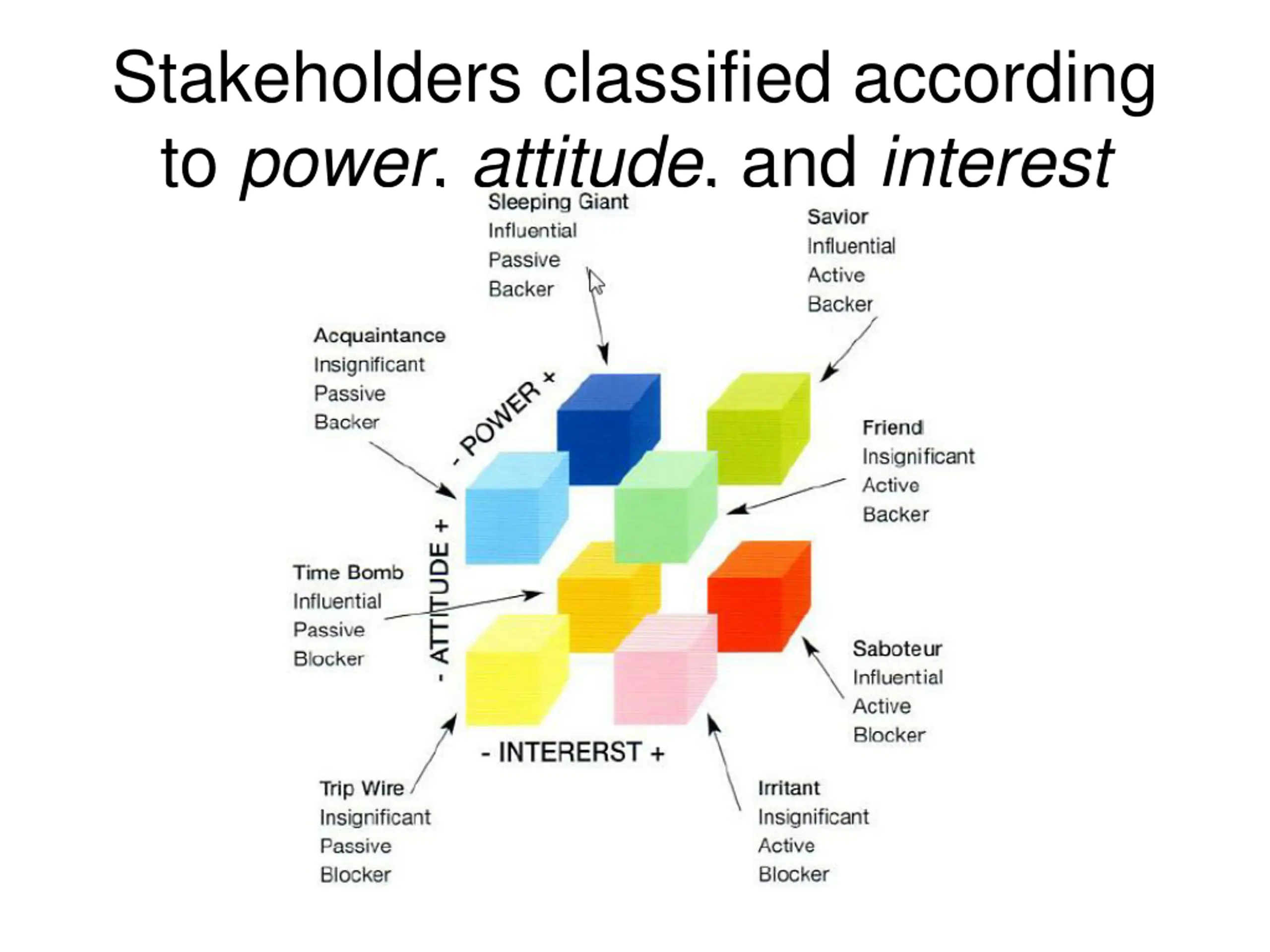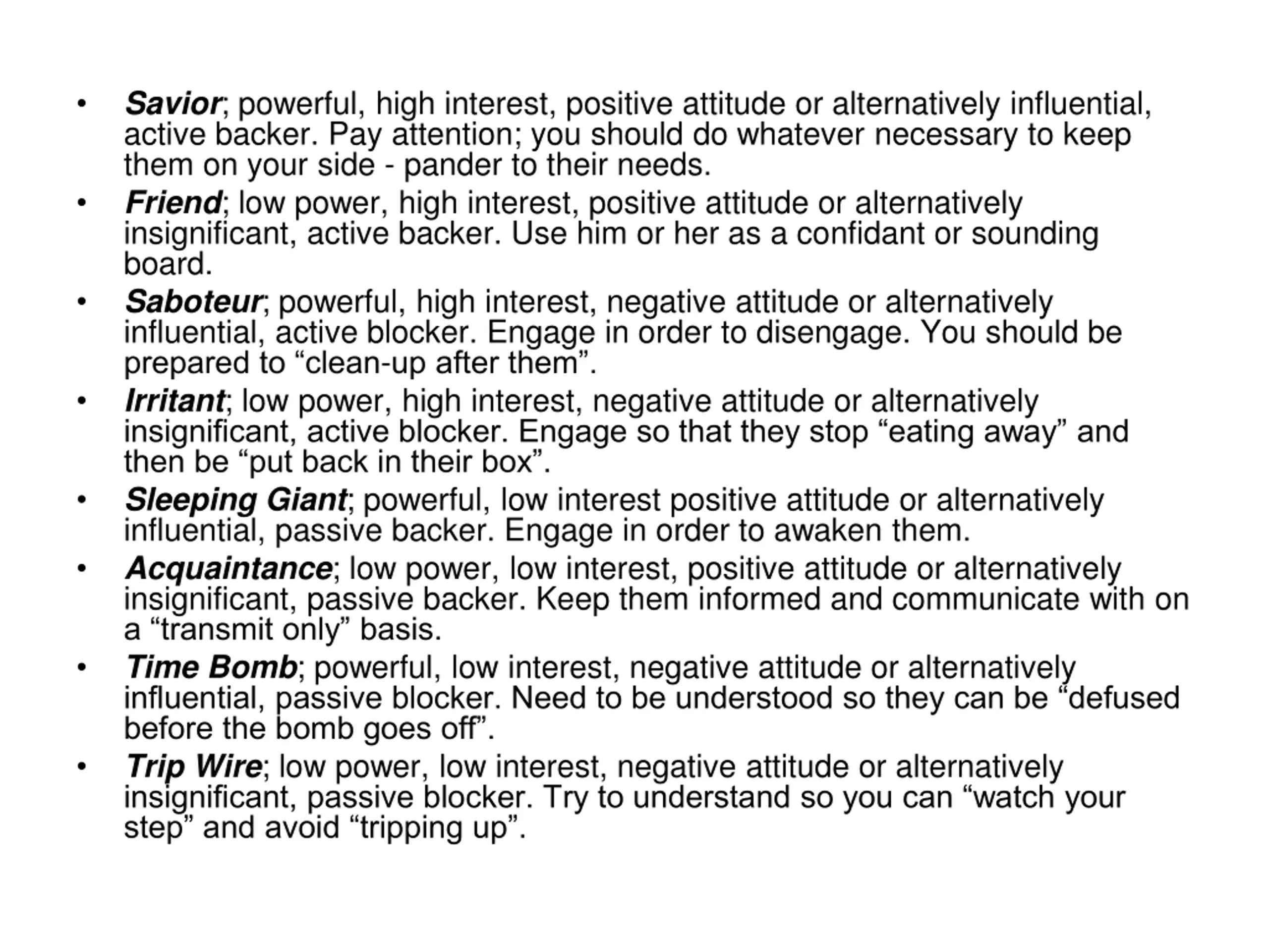 Savior; powerful, high interest, positive attitude or alternatively influential, active backer. Pay attention; you should do whatever necessary to keep them on your side - pander to their needs. Friend; low power, high interest, positive attitude or alternatively insignificant, active backer. Use him or her as a confidant or sounding board. Saboteur; powerful, high interest, negative attitude or alternatively influential, active blocker. Engage in order to disengage. You should be prepared to clean-up after them . Irritant; low power, high interest, negative attitude or alternatively insignificant, active blocker. Engage so that they stop eating away and then be put back in their box . Sleeping Giant; powerful, low interest positive attitude or alternatively influential, passive backer. Engage in order to awaken them. Acquaintance; low power, low interest, positive attitude or alternatively insignificant, passive backer. Keep them informed and communicate with on a transmit only basis. Time Bomb; powerful, low interest, negative attitude or alternatively influential, passive blocker. Need to be understood so they can be defused before the bomb goes off . Trip Wire; low power, low interest, negative attitude or alternatively insignificant, passive blocker. Try to understand so you can watch your step and avoid tripping up .