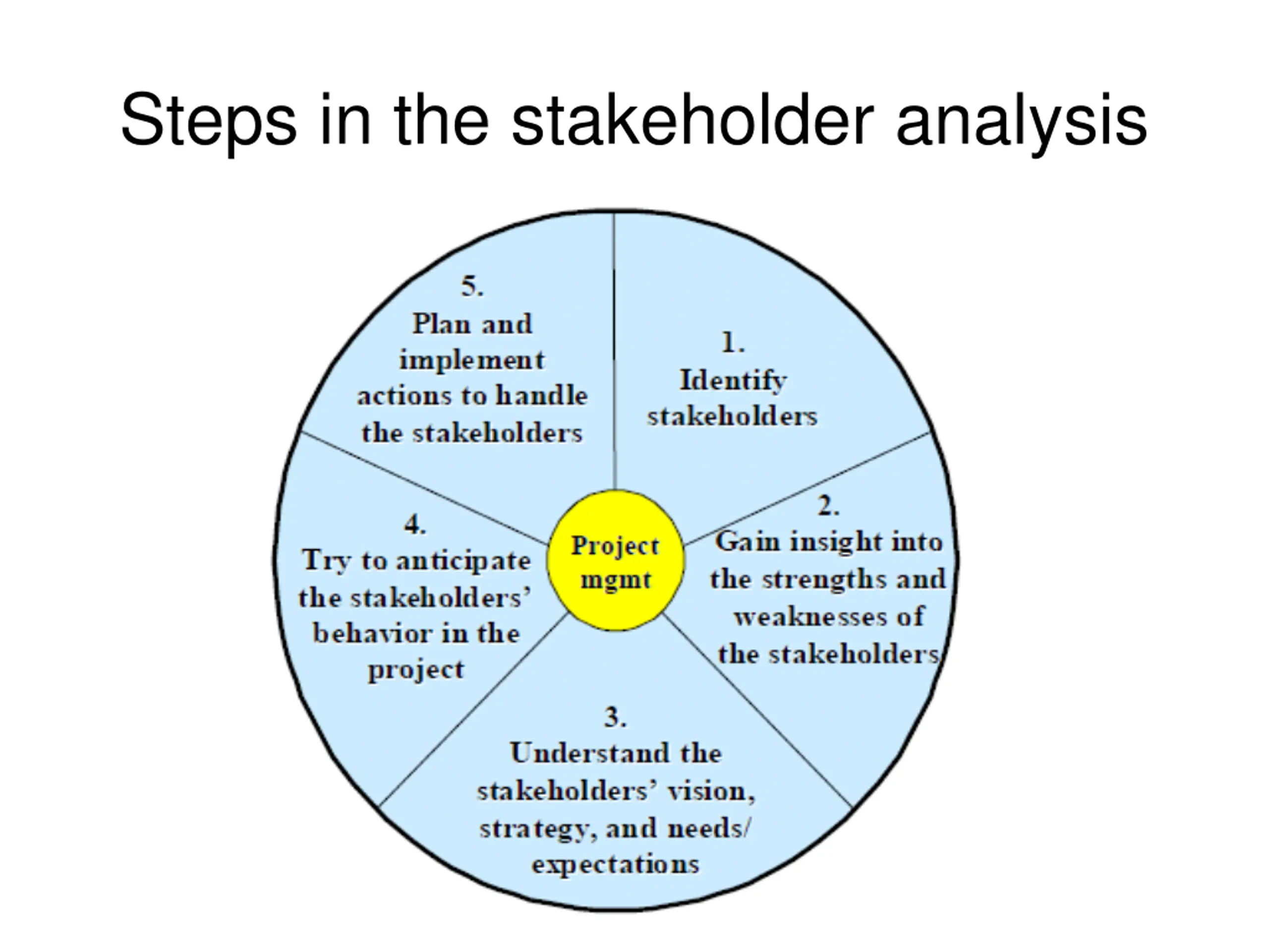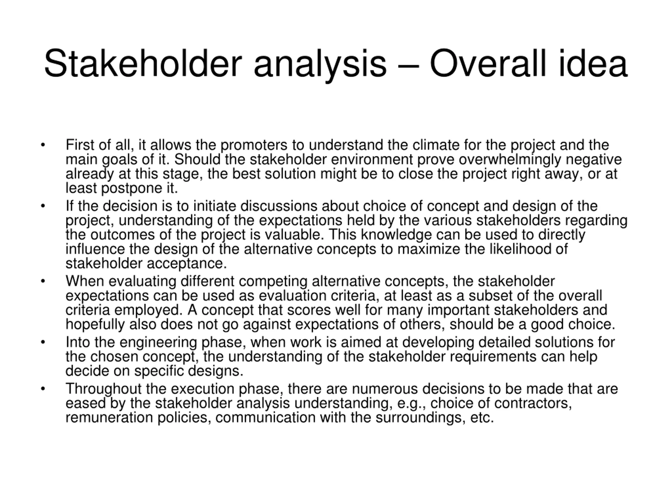 Stakeholder analysis Overall idea First of all, it allows the promoters to understand the climate for the project and the main goals of it. Should the stakeholder environment prove overwhelmingly negative already at this stage, the best solution might be to close the project right away, or at least postpone it. If the decision is to initiate discussions about choice of concept and design of the project, understanding of the expectations held by the various stakeholders regarding the outcomes of the project is valuable. This knowledge can be used to directly influence the design of the alternative concepts to maximize the likelihood of stakeholder acceptance. When evaluating different competing alternative concepts, the stakeholder expectations can be used as evaluation criteria, at least as a subset of the overall criteria employed. A concept that scores well for many important stakeholders and hopefully also does not go against expectations of others, should be a good choice. Into the engineering phase, when work is aimed at developing detailed solutions for the chosen concept, the understanding of the stakeholder requirements can help decide on specific designs. Throughout the execution phase, there are numerous decisions to be made that are eased by the stakeholder analysis understanding, e.g., choice of contractors, remuneration policies, communication with the surroundings, etc.