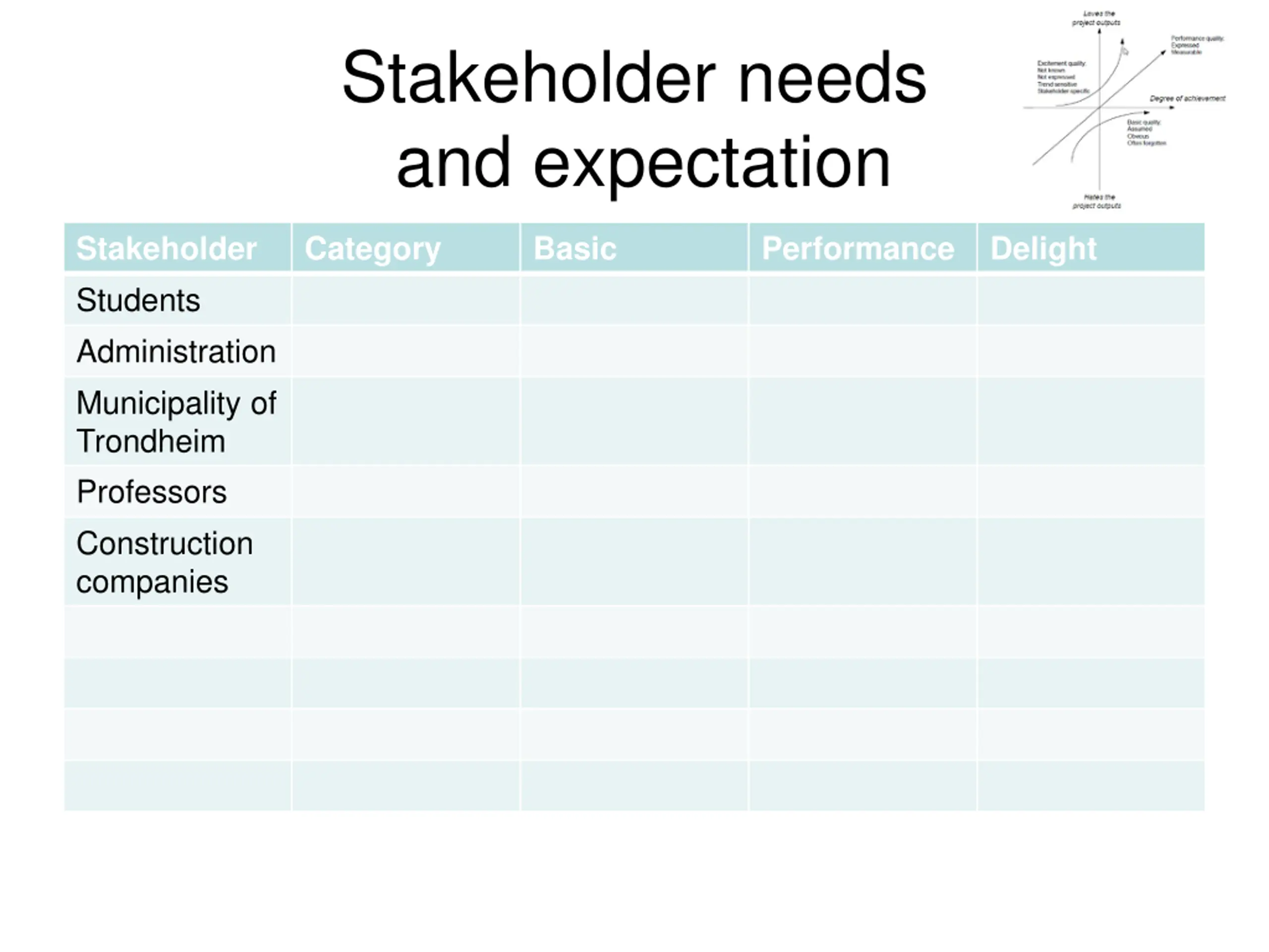 Stakeholder needs and expectation Stakeholder Students Administration Municipality of Trondheim Professors Construction companies Category Basic Performance Delight