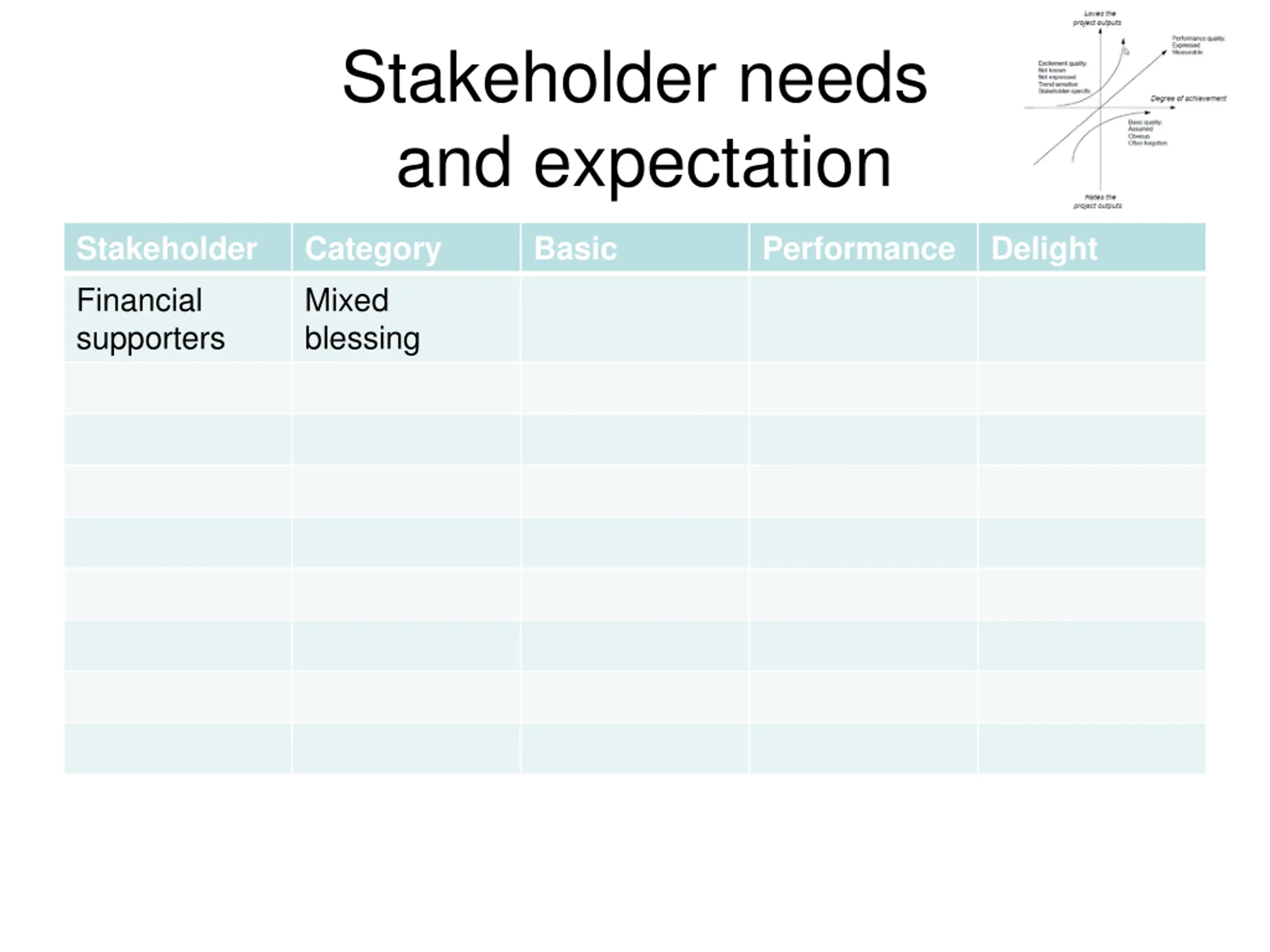 Stakeholder needs and expectation Stakeholder Financial supporters Category Mixed blessing Basic Performance Delight