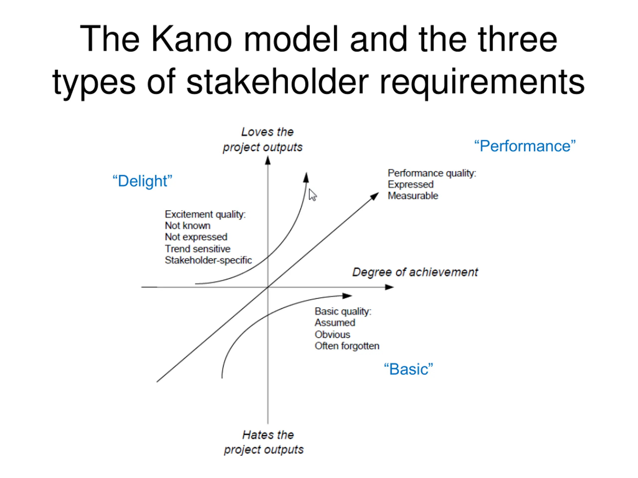 The Kano model and the three types of stakeholder requirements Performance Delight Basic