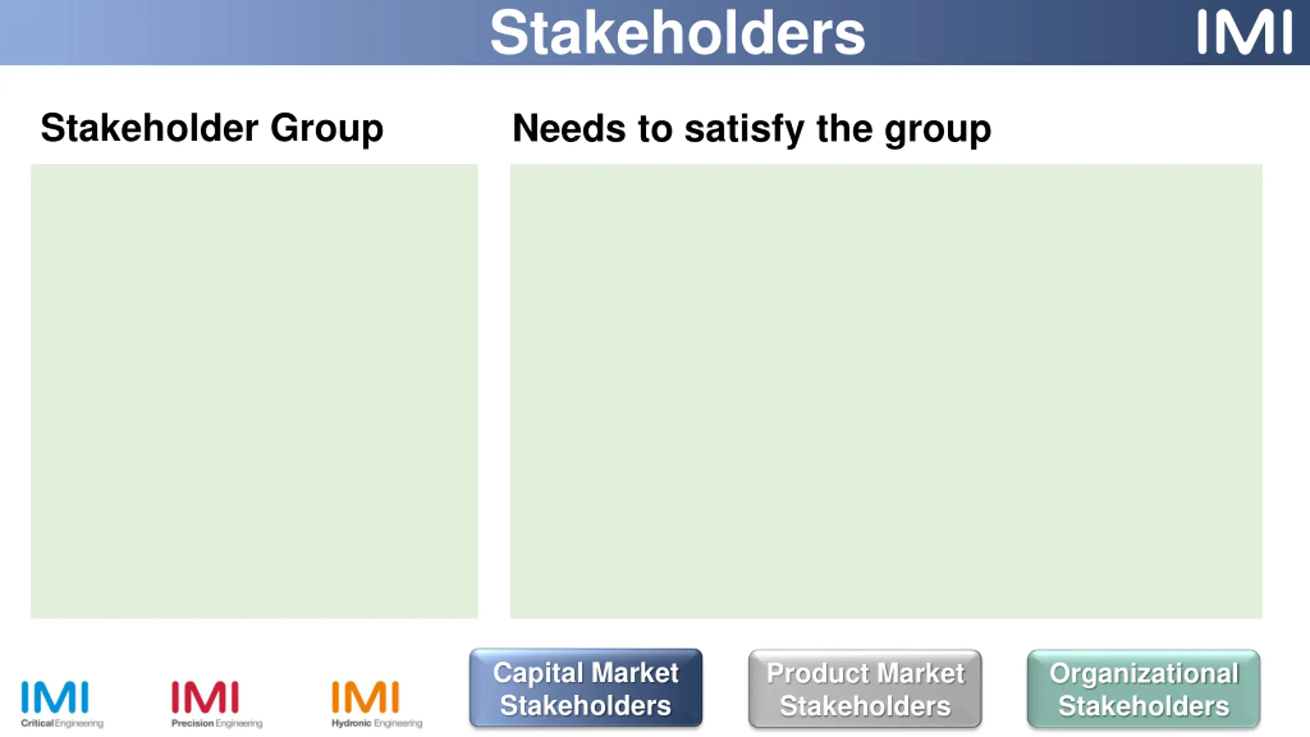 Stakeholders Stakeholder Group Needs to satisfy the group Capital Market Stakeholders Product Market Stakeholders Organizational Stakeholders